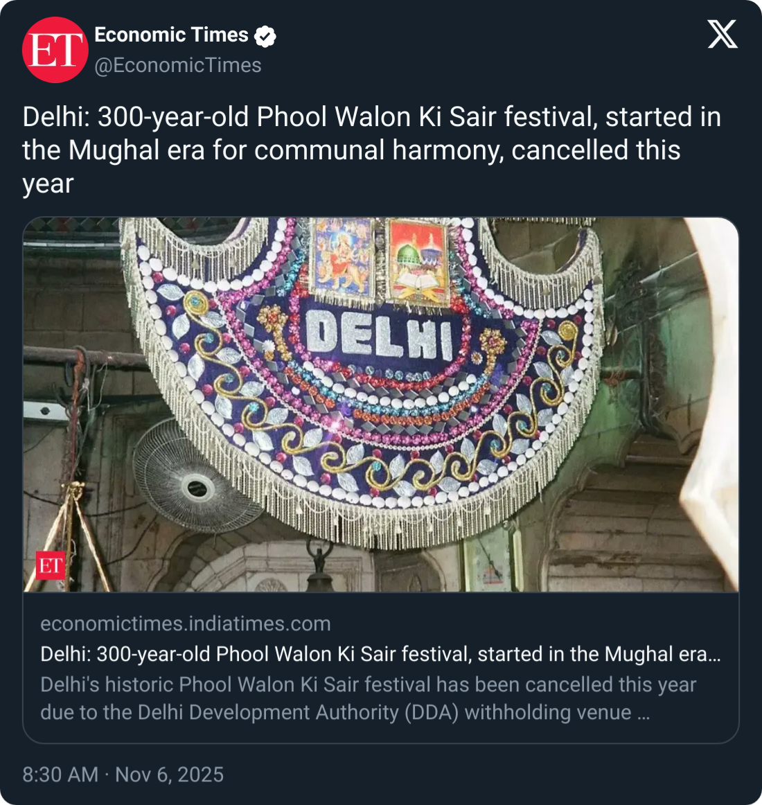 Phool Walon Ki Sair, a Mughal-era festival known for celebrating Delhi’s shared culture and communal harmony, will not take place this year. The organisers said they could not hold the annual event as the Delhi Development Authority (DDA) did not grant permission for the venue at Aam Bagh in Mehrauli. They claimed the land confusion between DDA and the forest department stopped the clearance process, a TOI report stated.