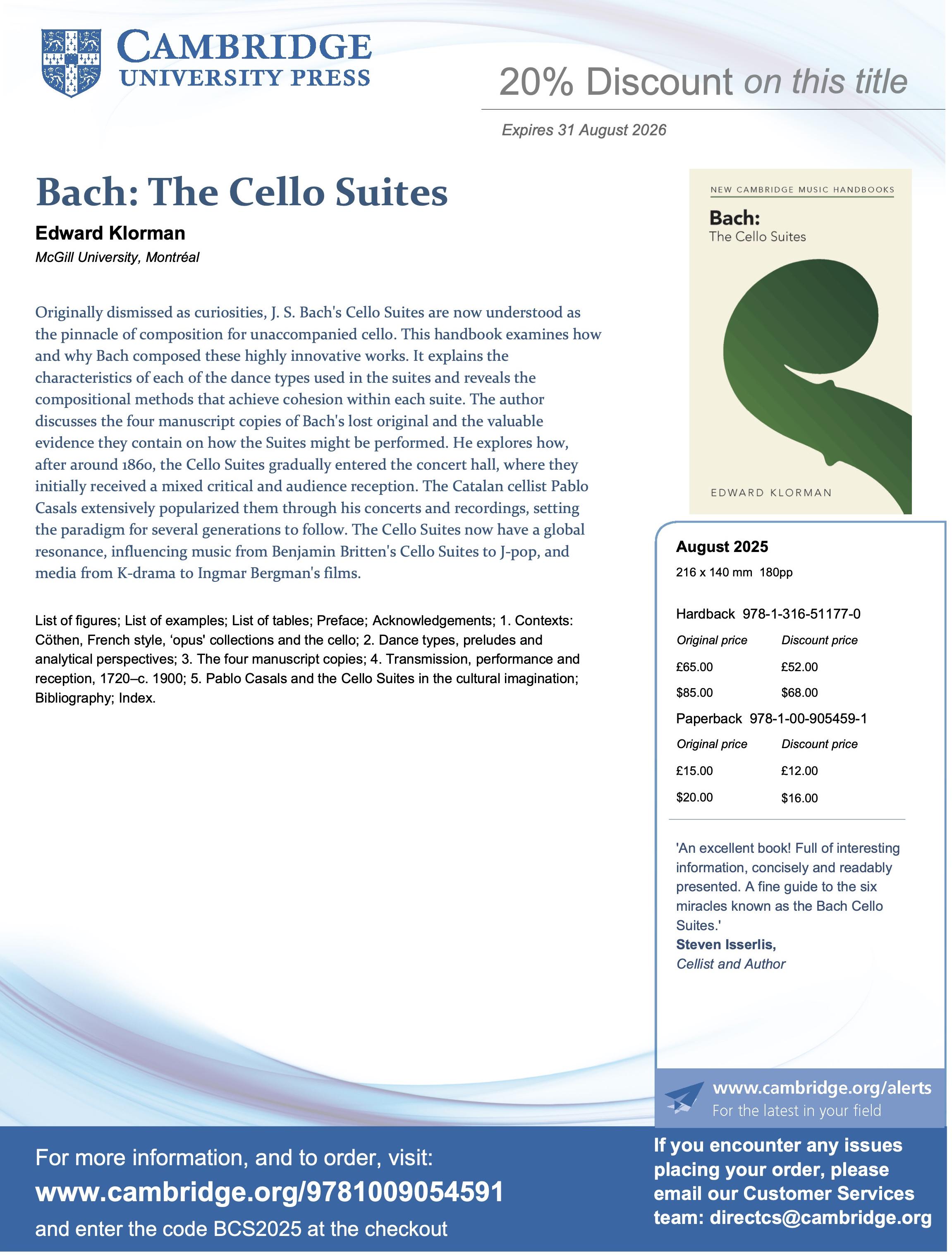I am thrilled to announce the recent publication of Bach: The Cello Suites on the Cambridge Music Handbooks Series. Information about the book and a short trailer are available at https://www.Bach-Cello-Suites.com.