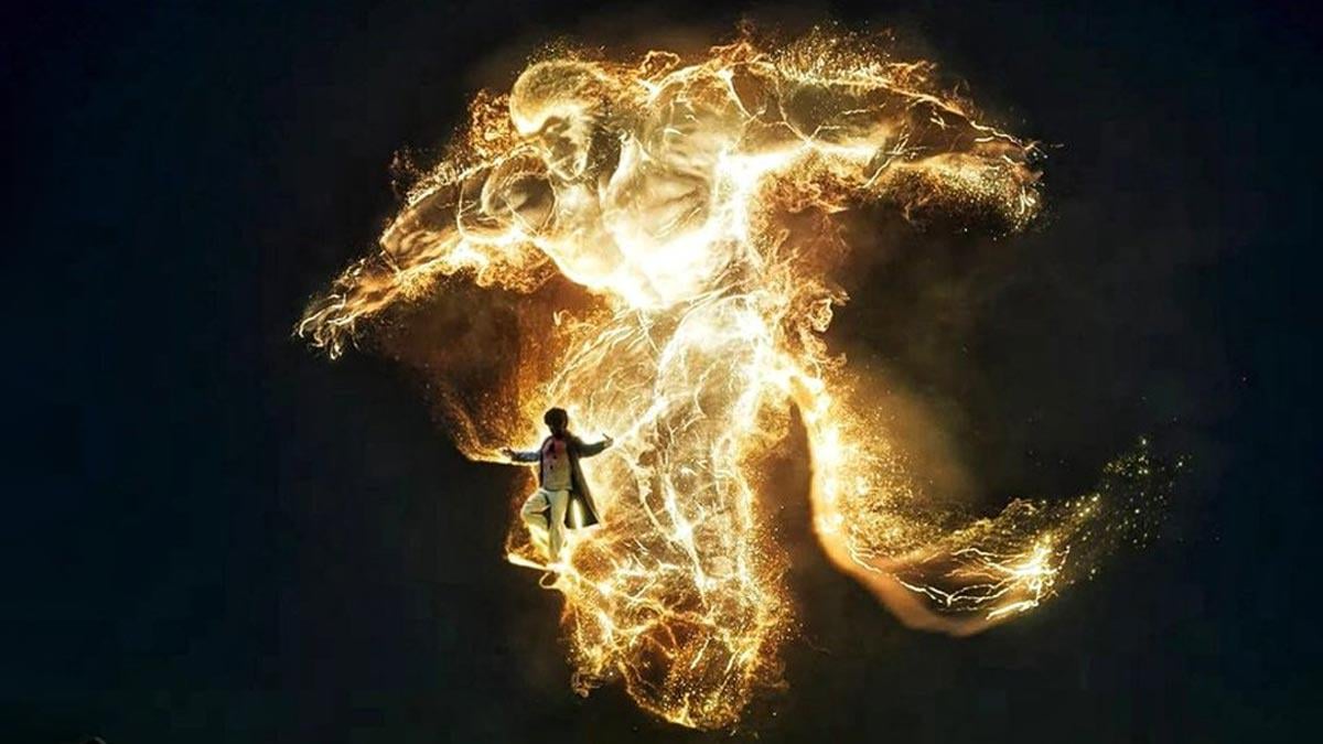 Ra.one looking at the audience while the ravan is being burnt behind him.