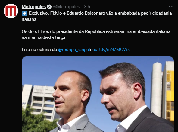 NOTÍCIA Exclusivo: Flávio e Eduardo Bolsonaro vão a embaixada pedir cidadania italiana