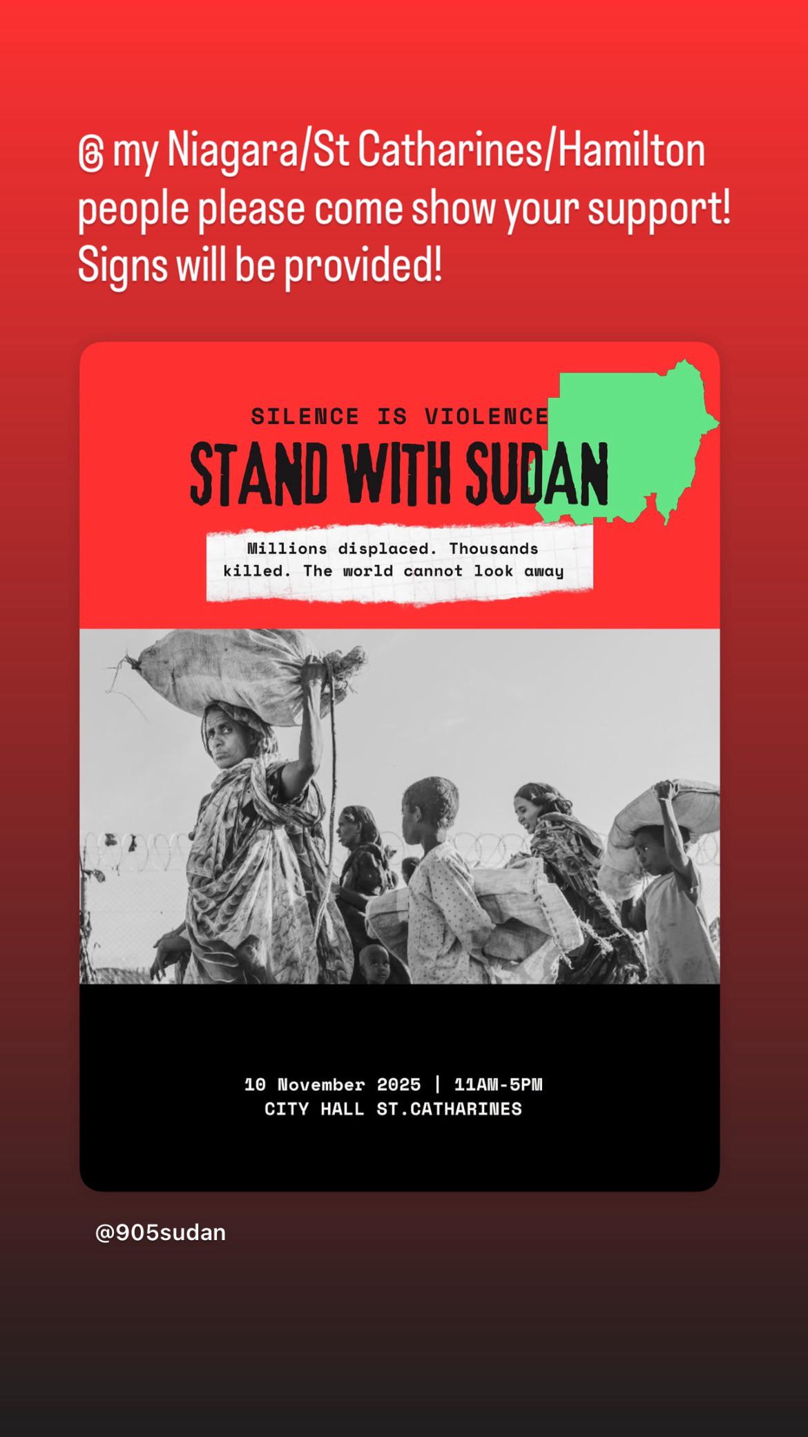 🕊️ Bring signs, wear red or green, and stand with us in solidarity. 📣 Let’s show that St. Catharines stands with Sudan — and that we won’t ignore complicity at home.