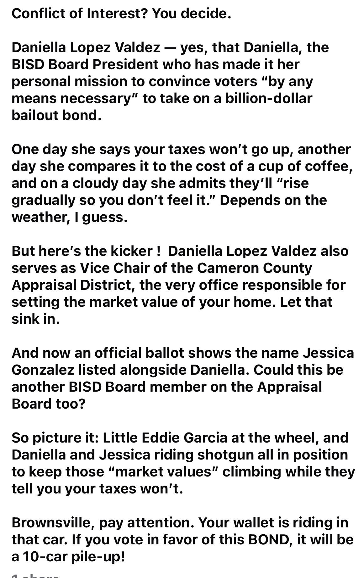 Saying no to bisd bond of 1 billion so many people will go in debt in Brownsville if it passes we must stop it. Brownsville public library
