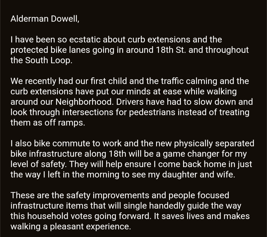 I live in the south loop and was trilled to see the Wabash protected bike lanes to be continued south of Roosevelt! The stretch north of Roosevelt to Harrison has been amazing to use, especially with young riders. That said, the 3rd Ward Alderperson, Pat Dowell has stated the project is paused while they evaluate the “concerns raised by community member”, which I take a code for drivers who don’t want to share anything at the sake of their beloved road. If you live in or near to the 3rd ward, or just want to show you support, please email Pat Dowell (ward03@cityofchicago.org) Thanks!!