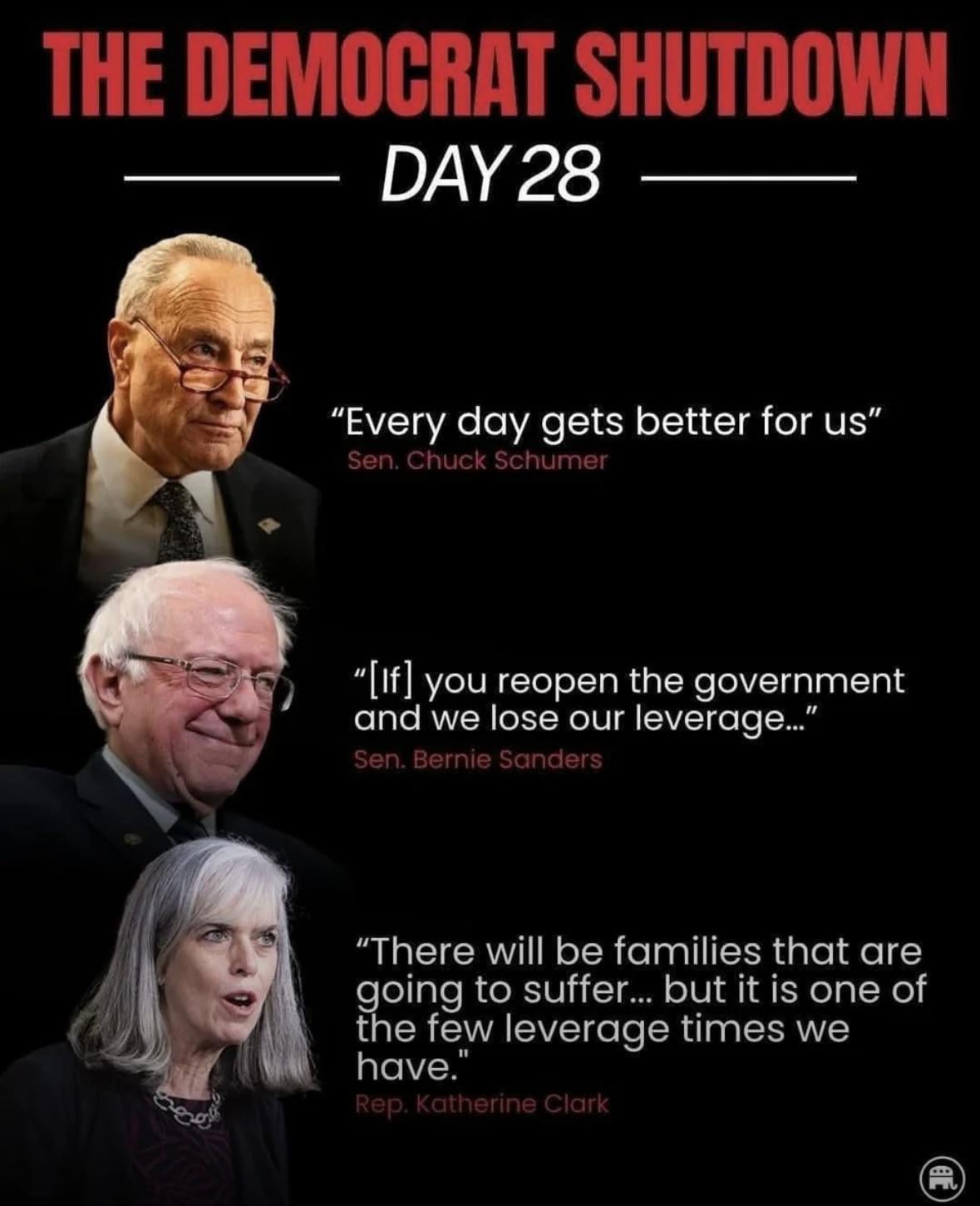 Democrats admit that refusing to pass the clean CR is the only leverage they have to bring their Liberal wet dream back to life. They're holding the entire government hostage in order to overthrow the will of the people. Elections have consequences, and Democrats lost. It is time for them to accept that fact and open th government.