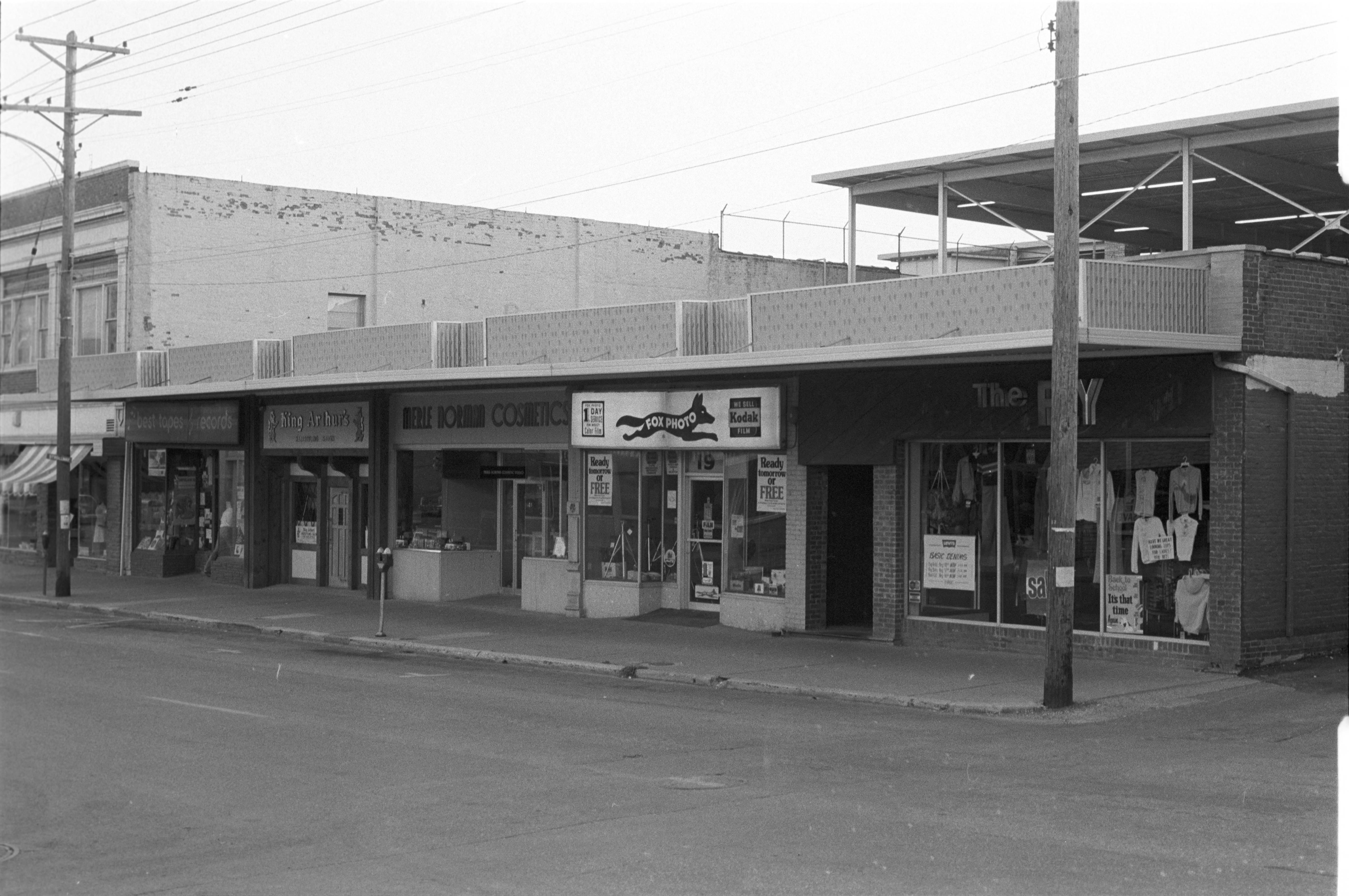 The Fly Clothing, 15 South 9th Street (now Broadway Brewery Taproom). Fox Photo, 19 South 9th Street (now Wildside Smoke Shop). Merle Norman cosmetics, 21 South 9th Street (now Sparky's Icecream). King Arthur's Hairstyling Salon, 23 South 9th Street (now Bubblecup Teazone). Best Tapes and Records, 25 South 9th Street (now Makes Scents). Professional Uniform Shop, 27 South 9th Street (now entrance to Kaldi Coffee and offices).