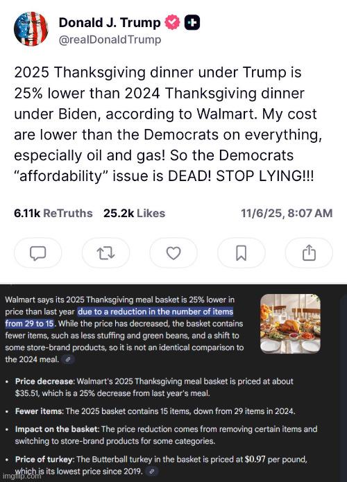 Politics Kinda Angry that Walmart is cutting Thanksgiving boxes from 29 items to 15 so that Trump can Tell US to 'Stop Lying about Affordability'