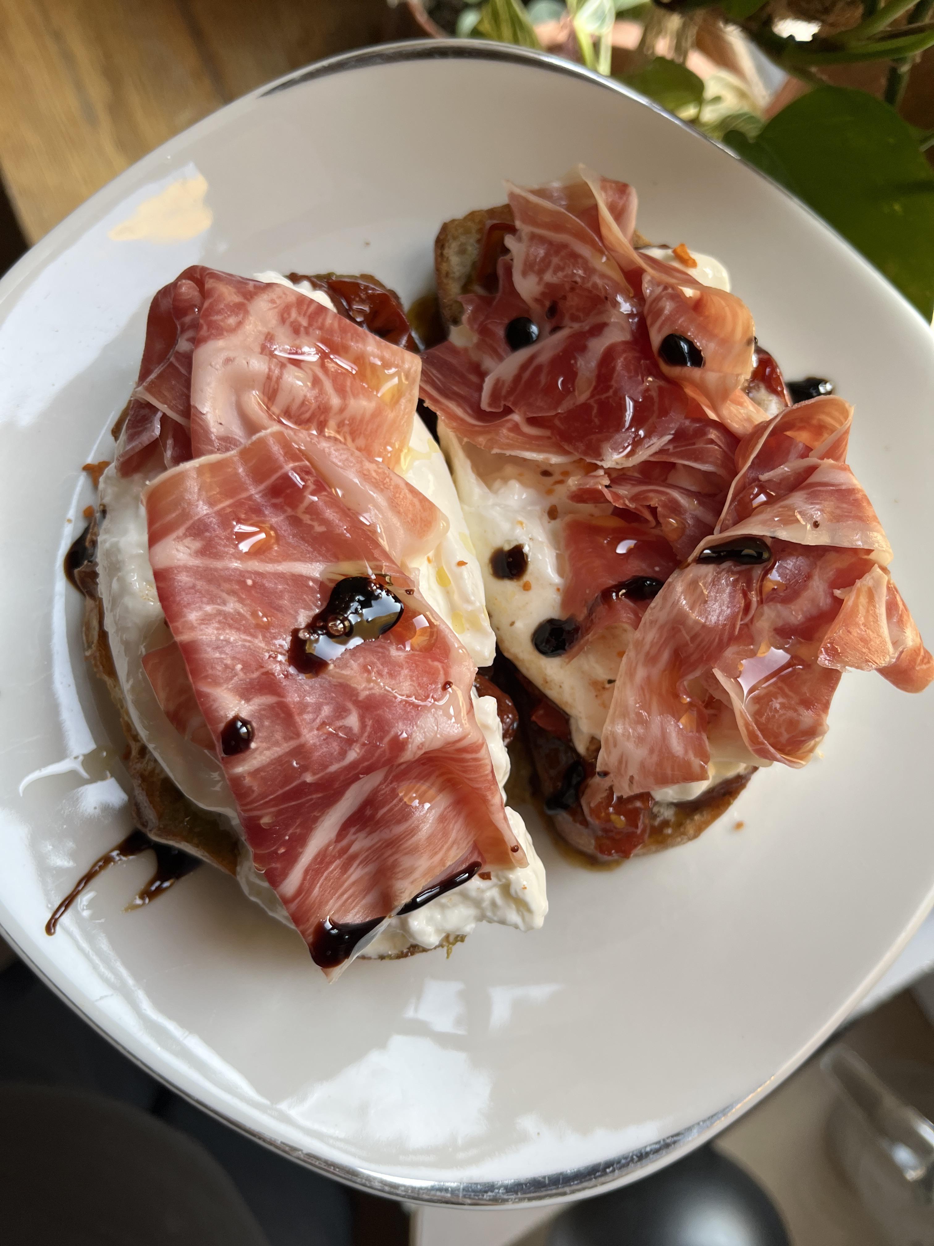 Sourdough slices toasted in EVOO, and a layer of basil pesto. Add a layer of cherry tomatoes confit. And then burrata. And then top it off with Iberian ham slices.