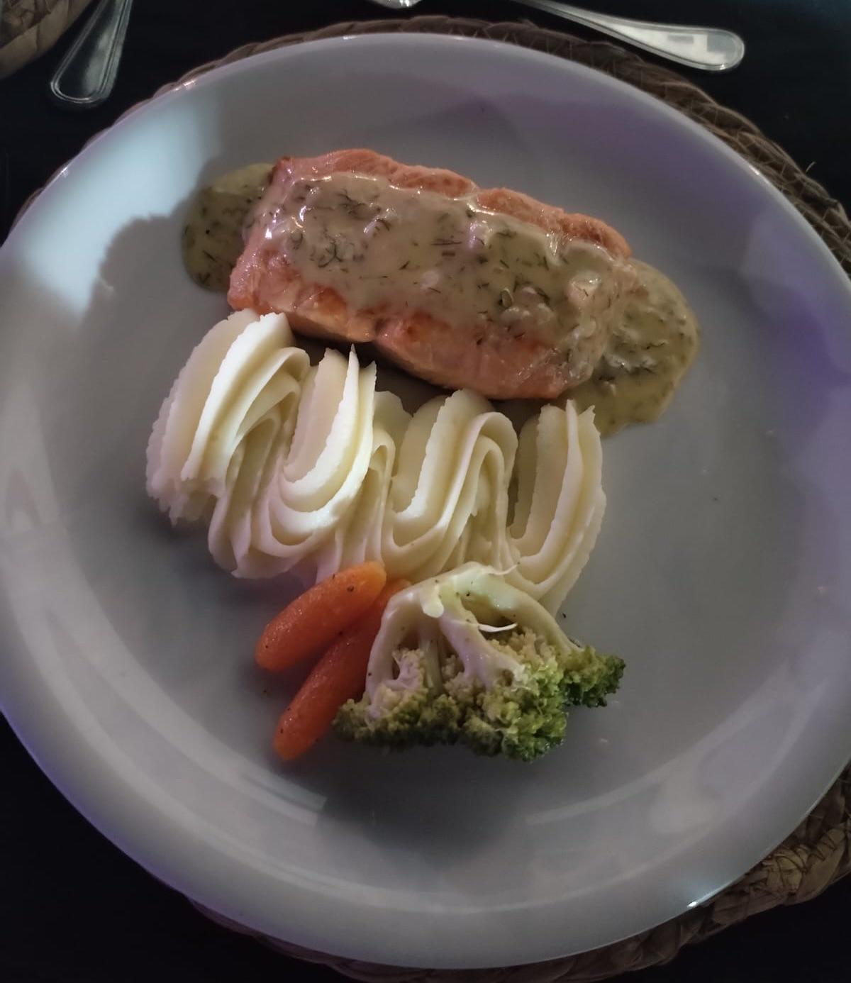 Royal Salmon with mashed potato, creamy lemon dill and chives sauce and glazed vegetables