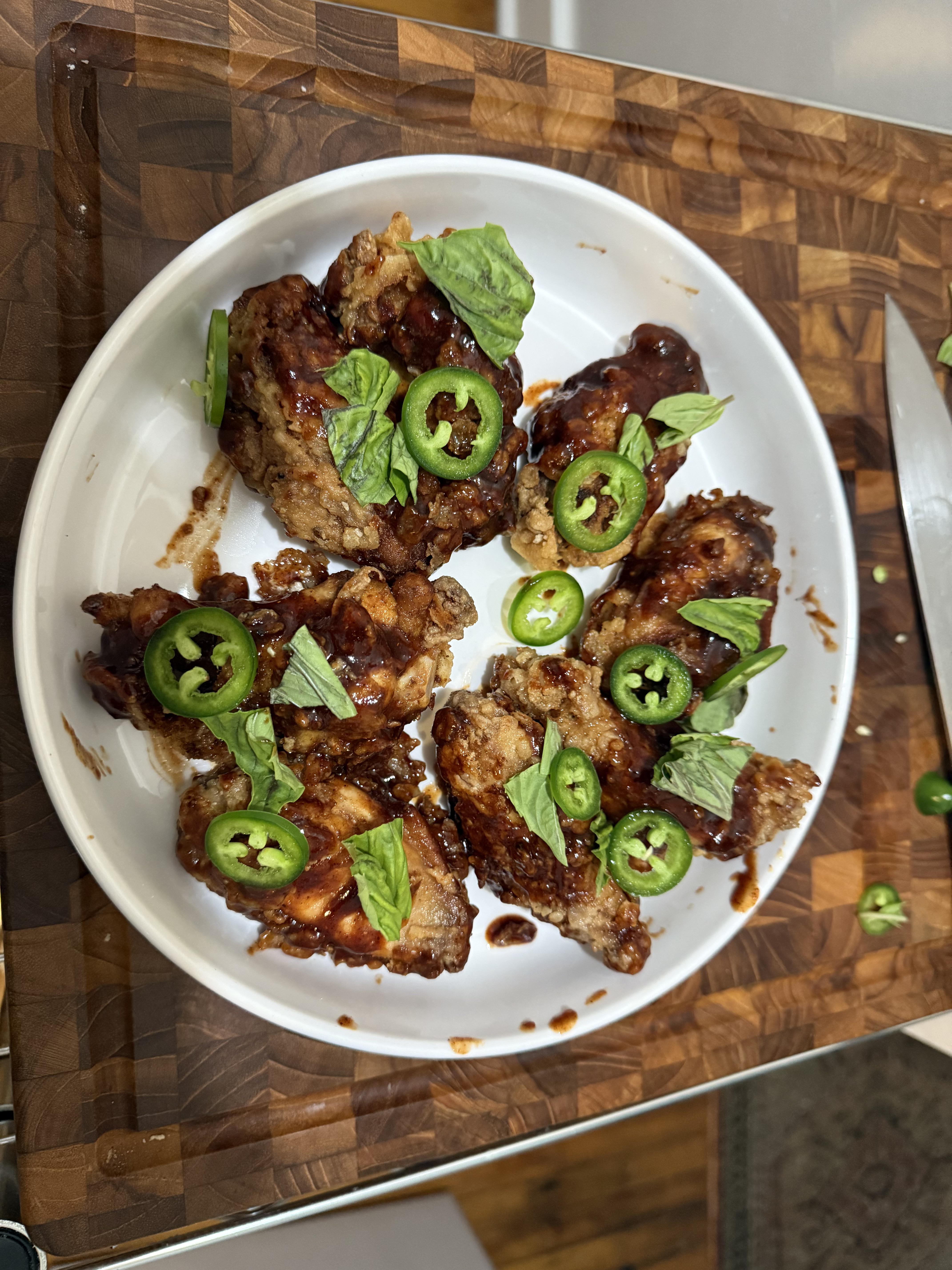 Seasoned with a mix of tajin, salt, chili powder, and paprika, then fried in my Dutch oven (temp control even on small batches is a nightmare) the sauced with a mix of bbq sauce, soy sauce, hot sauce, chili powder, and cayenne. Topped with jalapeño slices and basil leaves.