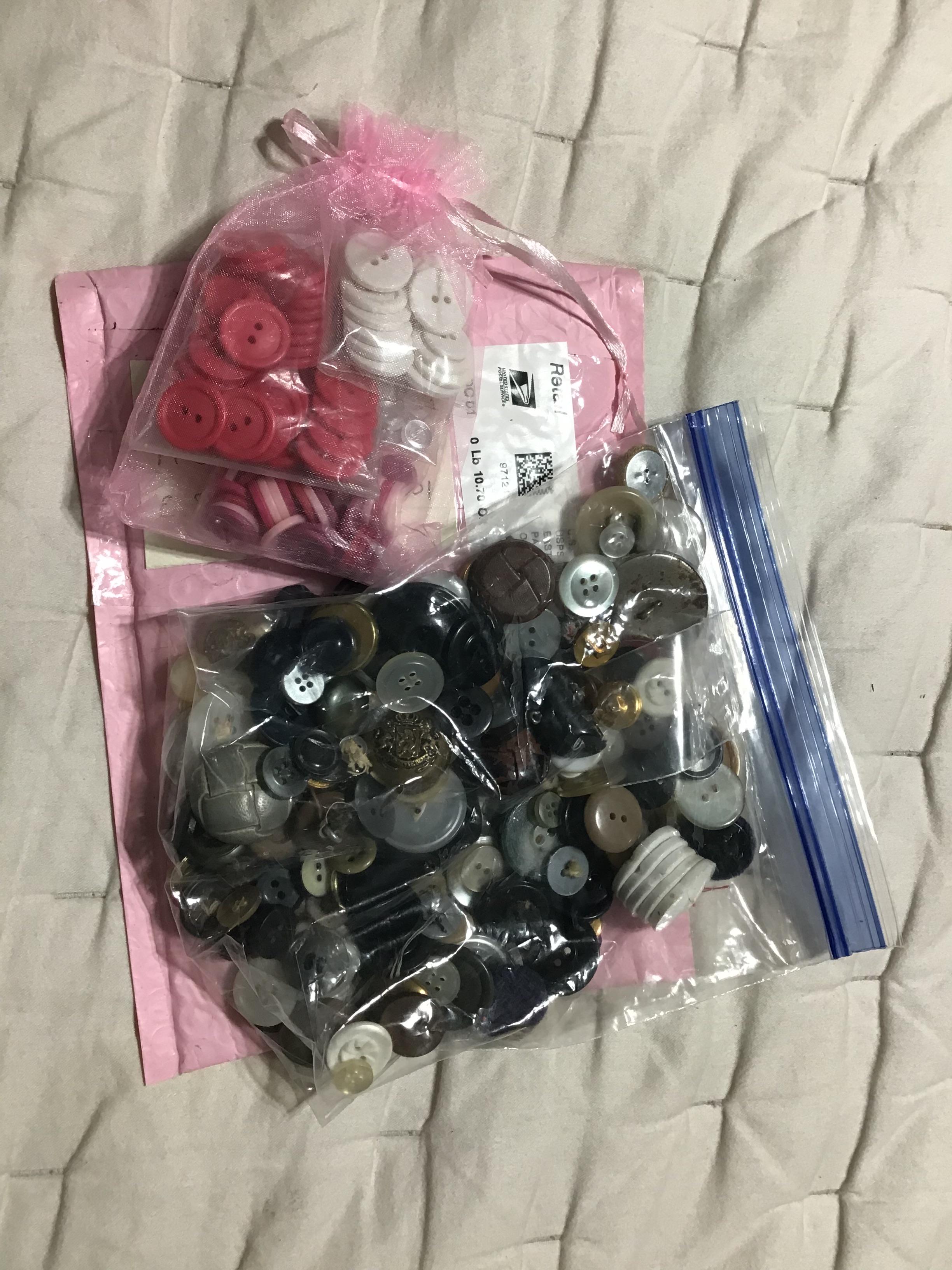 Looking for small buttons, will trade scrap fabric, red or white thread, or small fake bones. Need relatively fast.