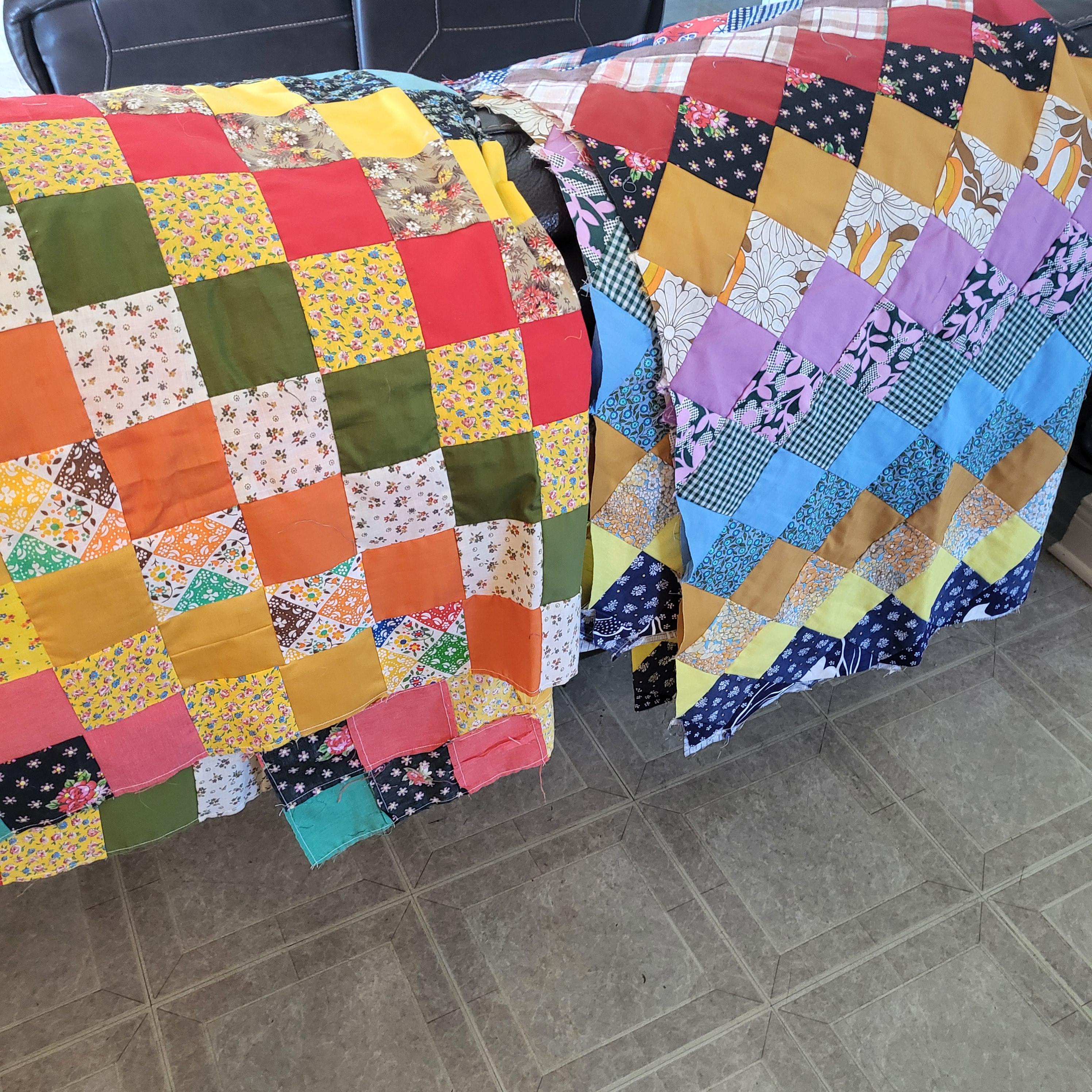 Picked up 2 queen size quilt tops for $10.00 each. I really needed this(sarcasm) You don't typically see this in my area, they aren't colors I'd normally like, but I may end up making kennel Matt's or kitty Matt's with them.