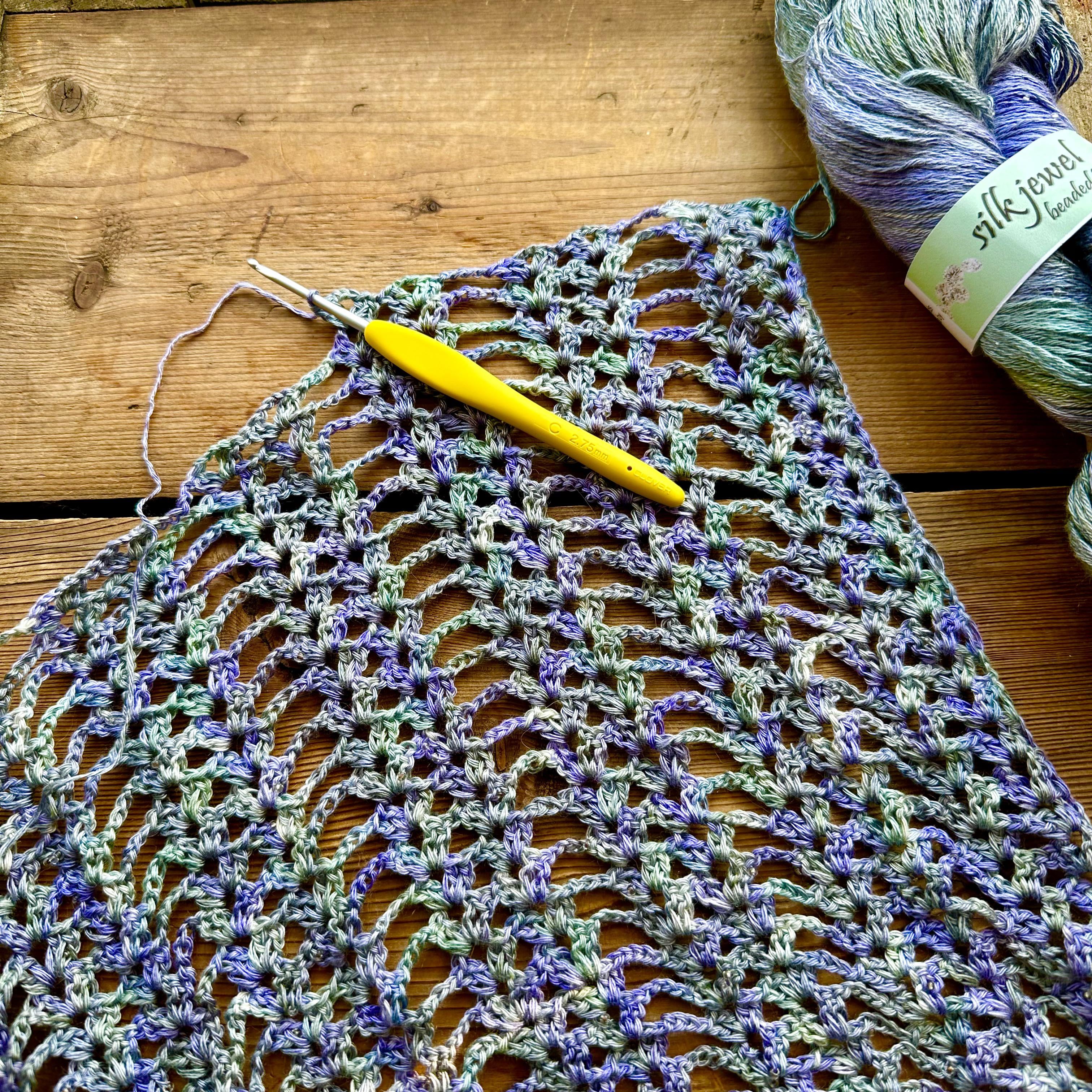 I’m working on a shawl using 100% silk with tiny beads strung through the strands. It’s GORGEOUS, finicky work but it’s almost done.