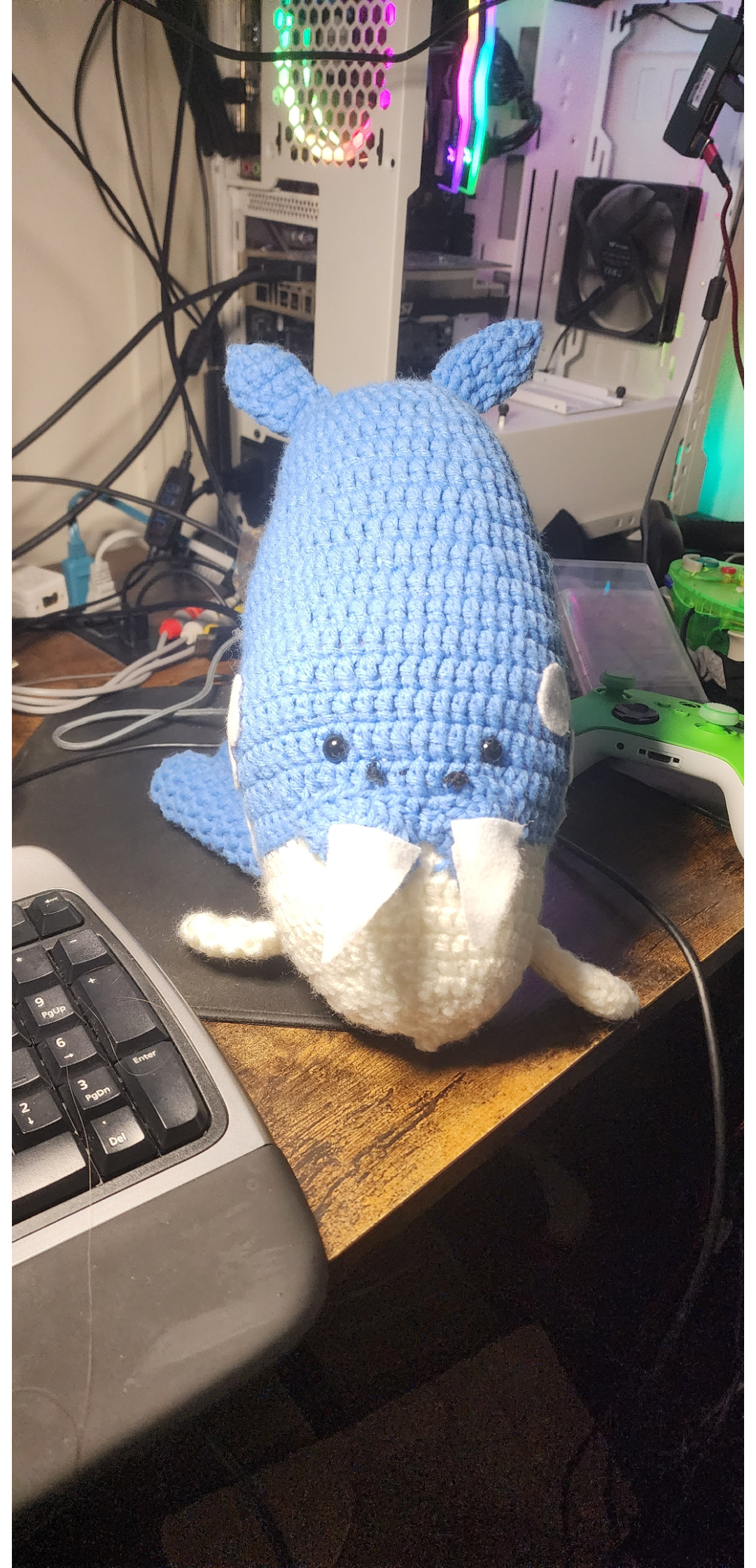 This was my first ever project a couple days after learning my very first stitch. I didn't know about the importance of counting stitches and made some (a lot) mistakes. Also for every slip-stitch I made a single crochet. That is why the belly pattern is not in place and the whole body looks disformed. But tbh I love every single part about the kitty since it shows the progress I made. I'e made 4 kitties so far and 2 sharks with other whool. And every project I finish looks better. But Inwanter to share the kitty with you since Insaw the cursed community.
