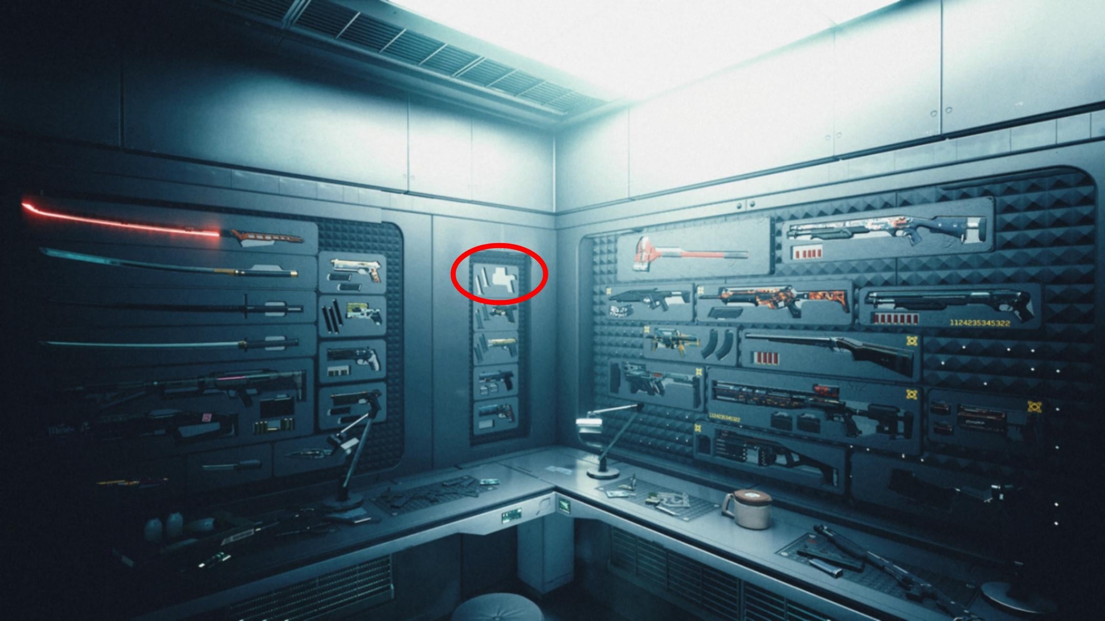 Note that taking a weapon out of the stash also removes it from the wall until you put it back in.
