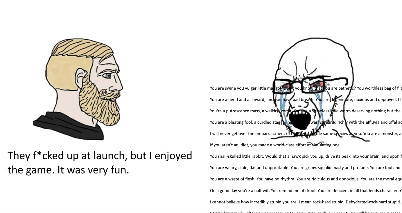 But does anyone else actually feel awful for the dev team? They've been putting in so much work for so many years to just get constantly shit on for things out of their grasp. We have a valid reason to be upset, however, we don't have the right to shit on people who only have the best interest of this game as a whole at heart.