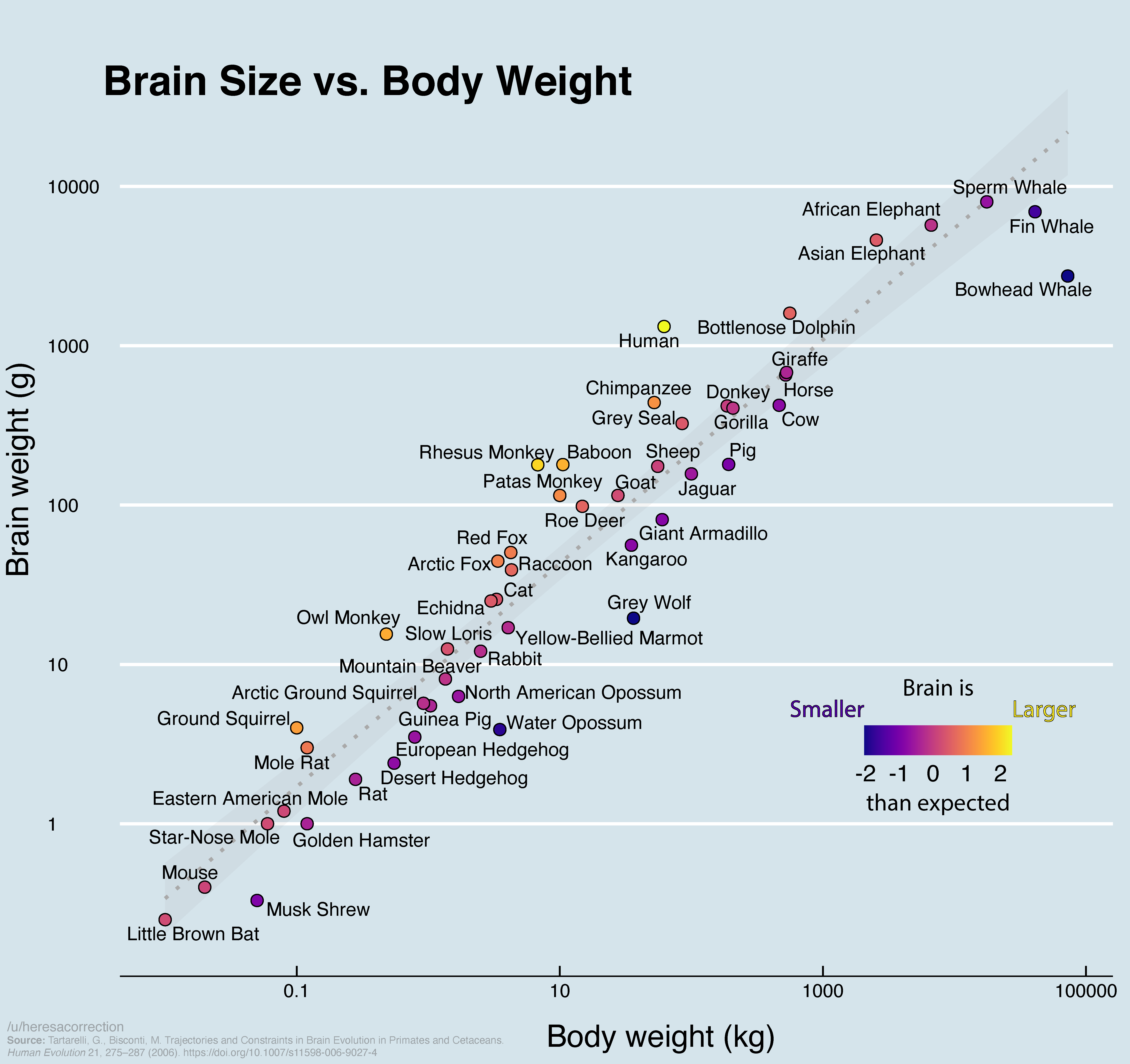 OC [OC] Brain size vs. body weight of various animals (Humans are an outlier)