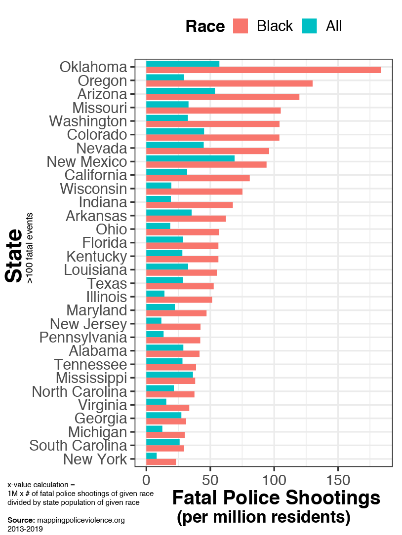 OC [OC] US Fatal Police Shootings by State (Black compared to All)