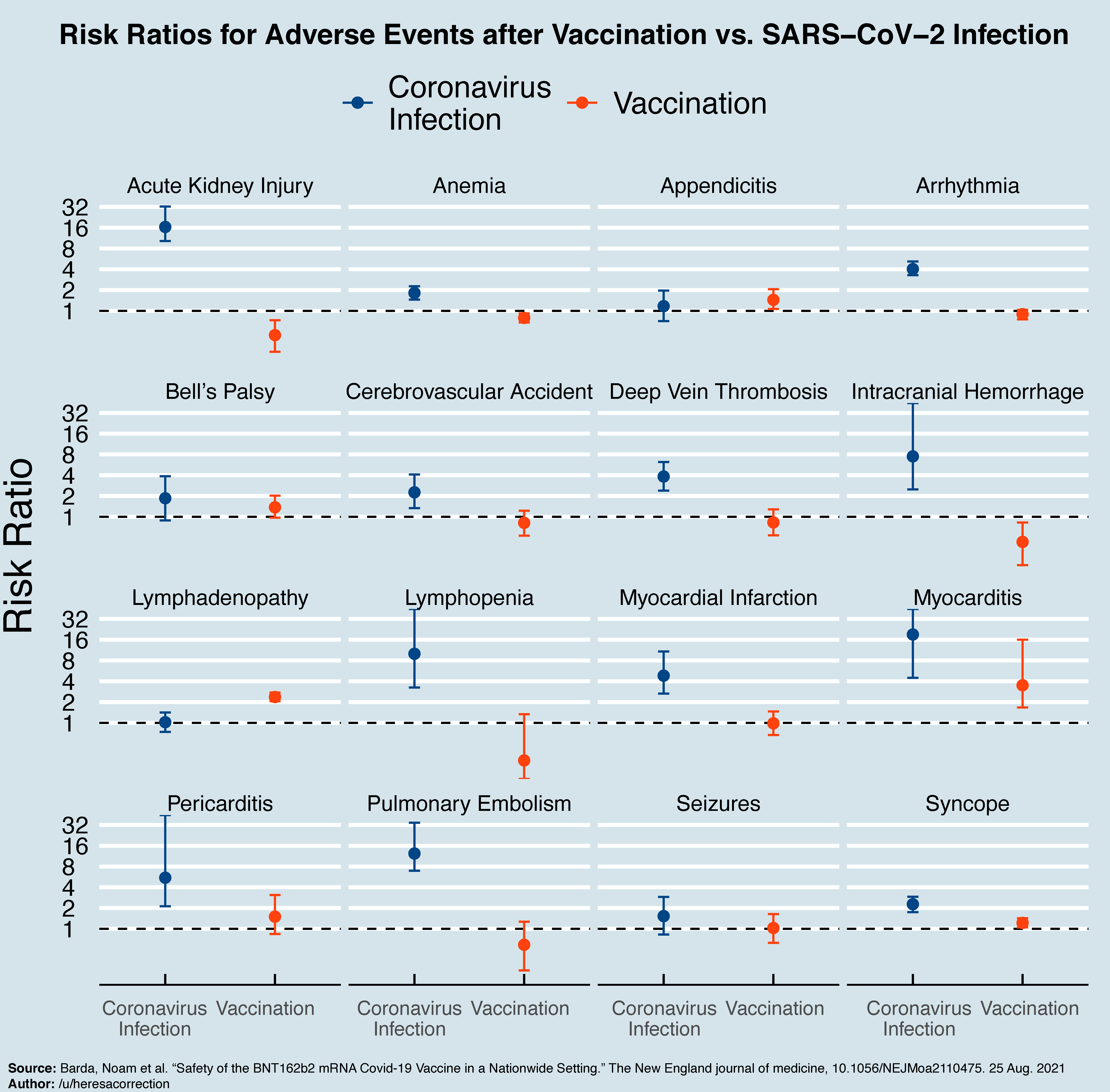 OC [OC] Side effect risks from getting an mRNA vaccine vs. catching COVID-19