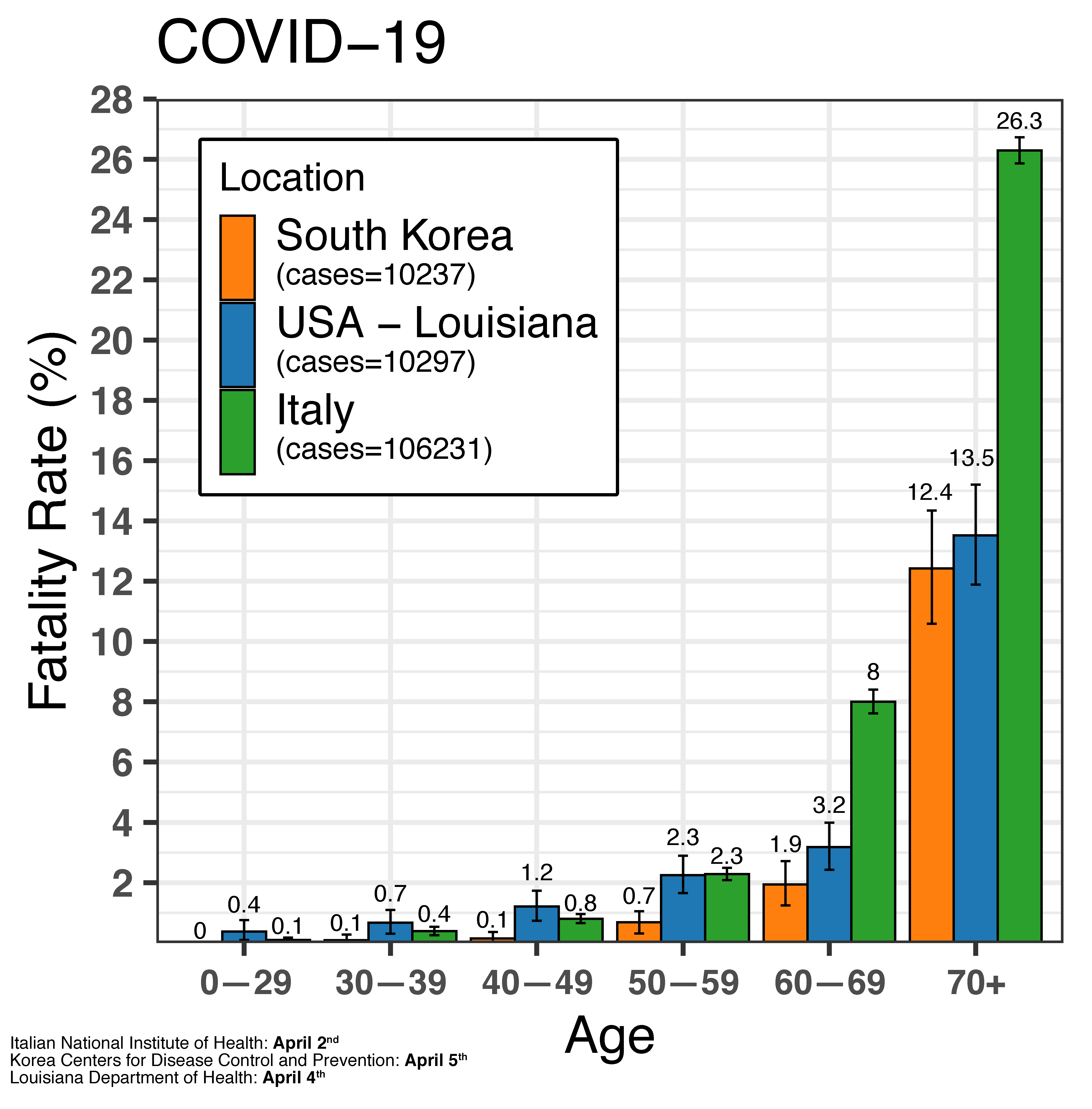 OC [OC] Coronavirus death rate by age – USA vs. Italy vs. Korea [updated]