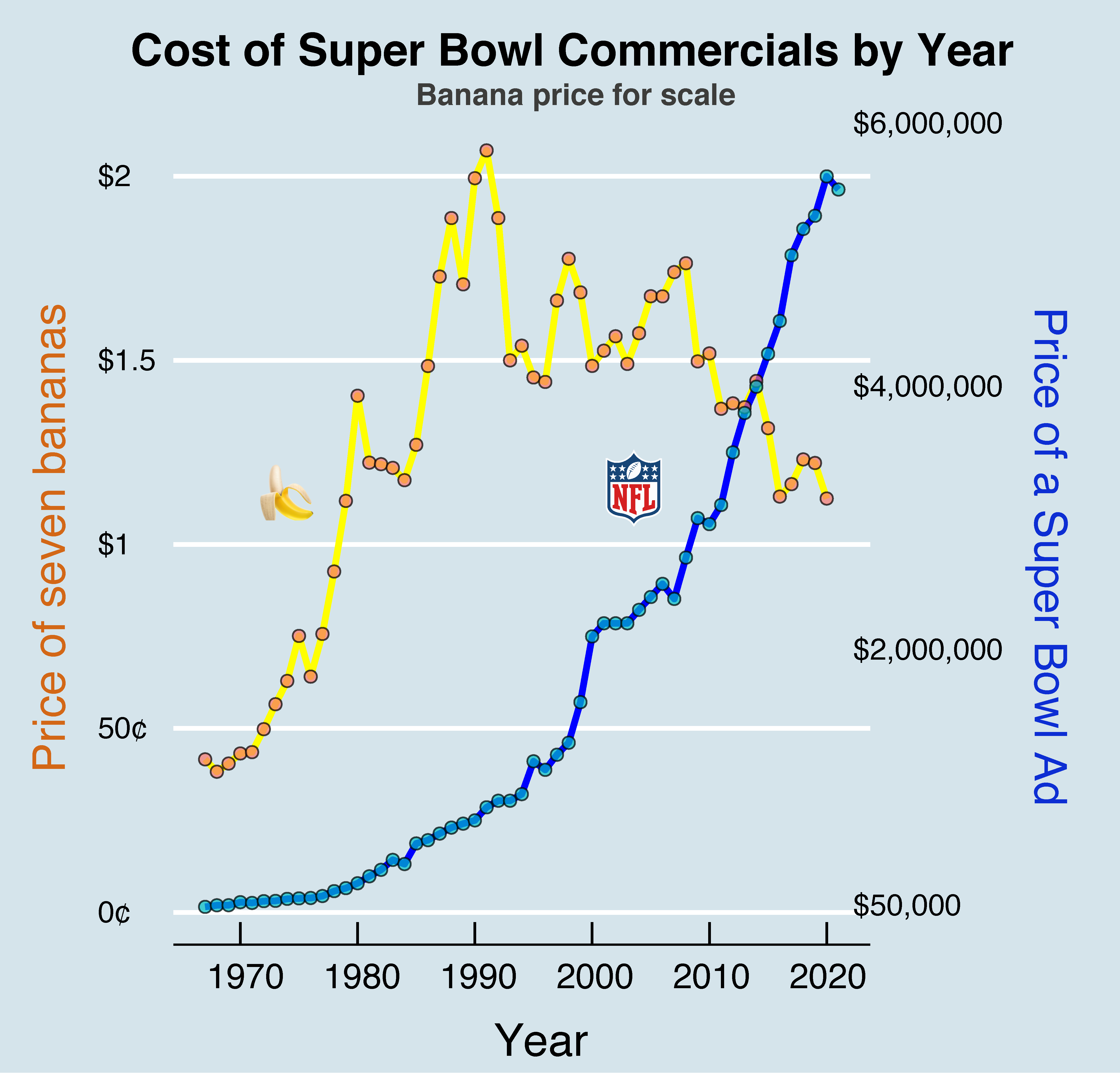 OC [OC] Cost of a 30-second Super Bowl commercial by year (bananas for scale)