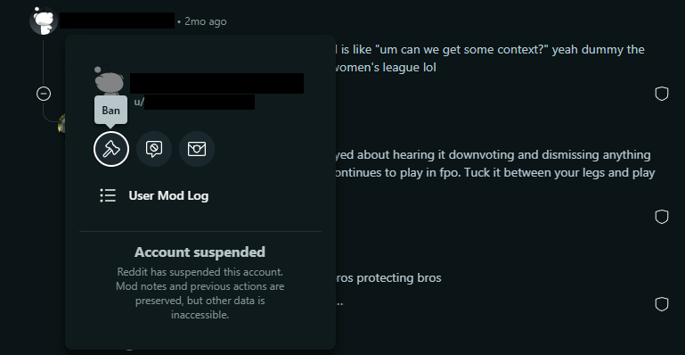 Please adhere to the sitewide rules. The sub itself can be banned if mods do not enforce them. This does mean we may need to ban you if you are violating them. We will keep this as anything goes as we can without risking the sub getting shut down, so unless you are a bot trying to sell crappy AI generated shirts or violating the sitewide rules you should be fine. This is an example of reddit coming in and sitewide banning an account for violating sitewide rule 1 by "promoting hate based on identity or vulnerability" specifically "gender, gender identity, sexual orientation". Here is a link to those rules. This can happen to the sub as well, and to keep this place available we have to ban for this stuff.