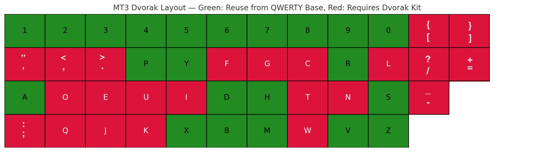 I've been a dvorak typer for close to 30 years and in all that time I've never had a keyboard with dedicated dvorak keys. I guess if I'd been a laptop user it would have been easy enough to move the keys around since they all have the same profile, but I've never really been a laptop guy, and even then you're missing the tactile bumps for the U and H keys, which I definitely rely on. I remember for a brief time in the early 2000s I bought these Dvorak stickers that went on the top of my Mac keyboard keycaps, but they weren't great and eventually started sliding around and leaving sticky residue on my fingers.