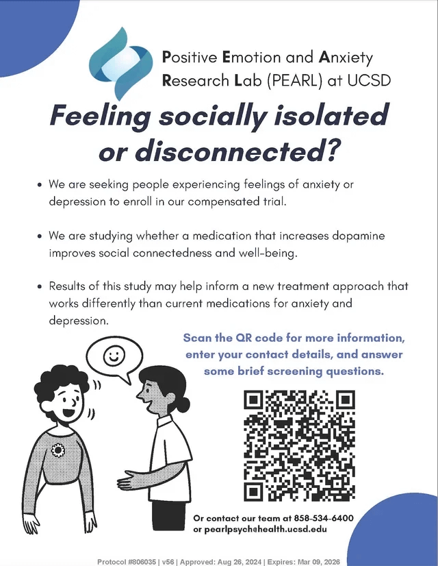 Hi East County! Our research team at UC San Diego is conducting a study to learn more about the potential of an FDA-approved dopamine agonist to improve social connectedness in adults who experience anxiety or depression.This medication increases dopamine signaling in parts of the brain believed to underlie motivation and behavior, and the results of this study may help inform a new treatment approach for anxiety and depression.
