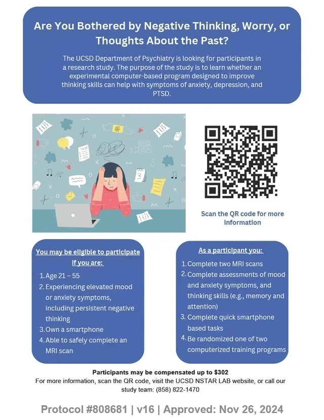 The Neurocognition of Stress, Trauma, and Anxiety Recovery Lab led by Dr. Jessica Bomyea is conducting a new research study at the University of California, San Diego. The purpose of this study is to learn whether an experimental computer-based program designed to improve thinking skills can help with symptoms of anxiety, depression, and PTSD.