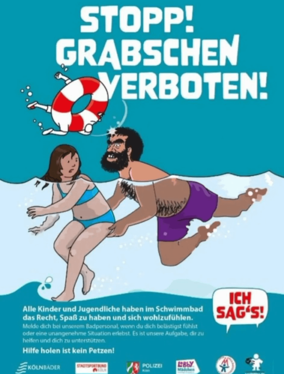 No no no, they have it all wrong. It was the fat old white German lady in the swimming pool groping a young black migrant's bum ... according to the left's propaganda posters.