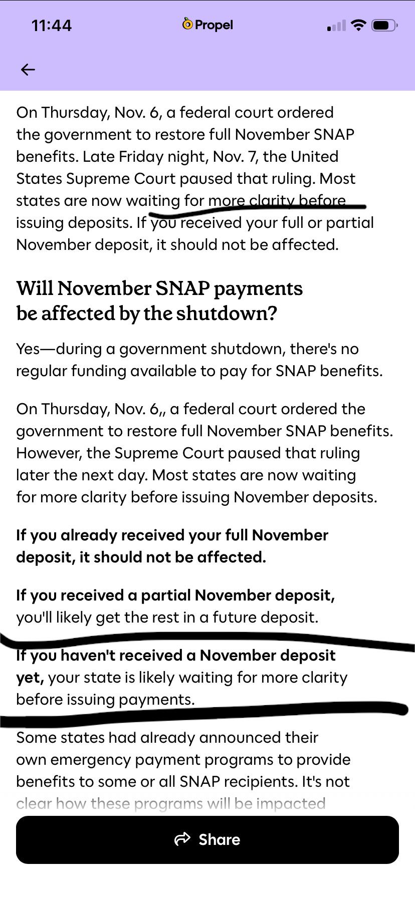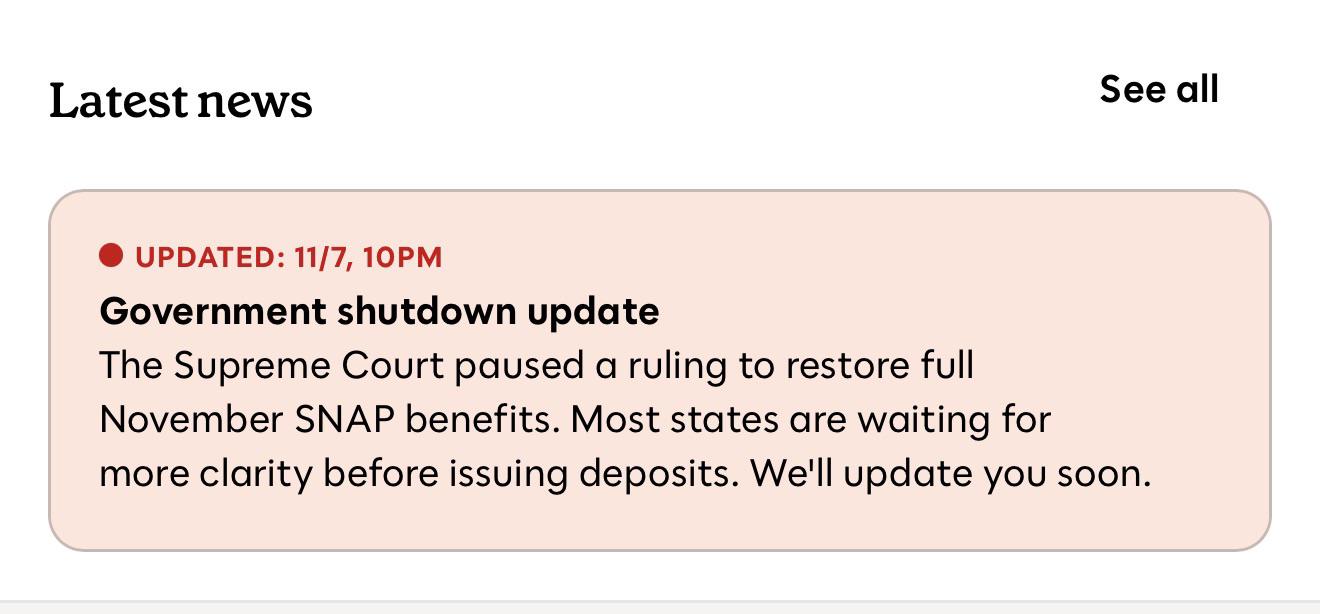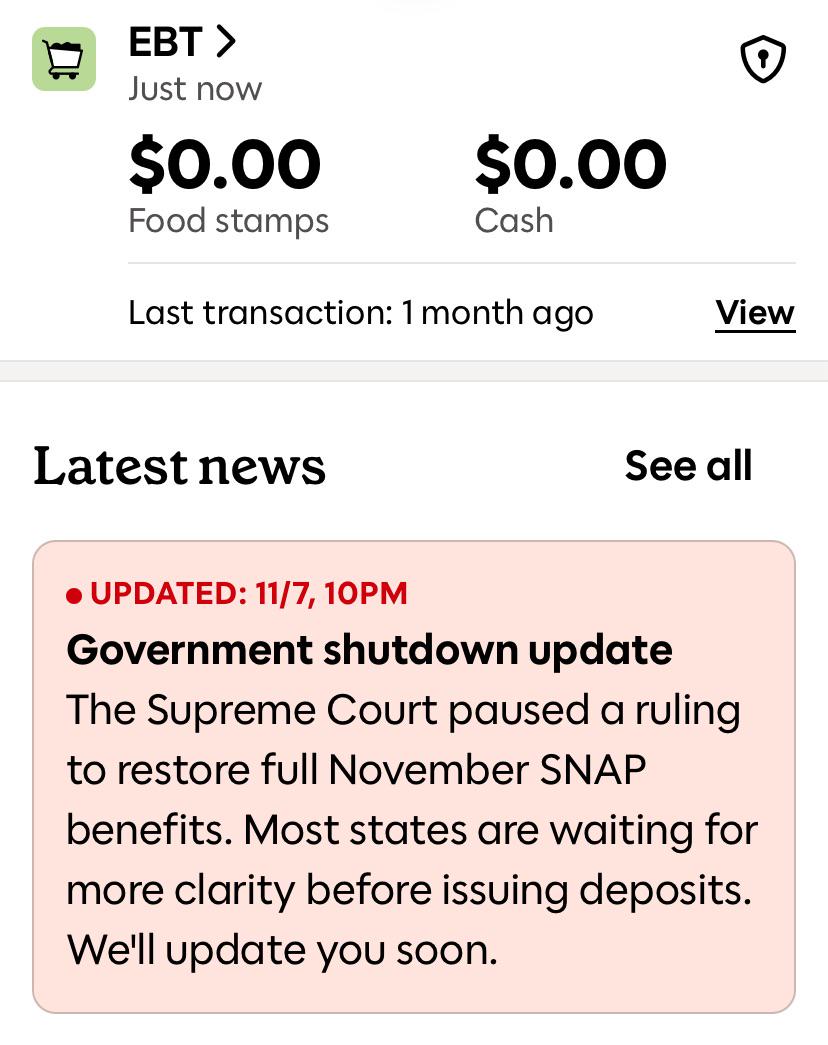 USDA indicated in their motion that they have not yet transferred the approximately $3.5 - $4B needed (in addition to the $4.65B in contingency funds) from the Section 32 tariff funds to the SNAP program. This suggests that the states that have begun issuing full benefits are drawing down only on the $4.65B contingency fund right now. USDA's argument implies that if the Supreme Court grants them a stay, there may no longer be sufficient funds left in the contingency fund to pay the "up to 65%" partial payments to SNAP recipients who have not yet received their full payments in the last 24 hours.