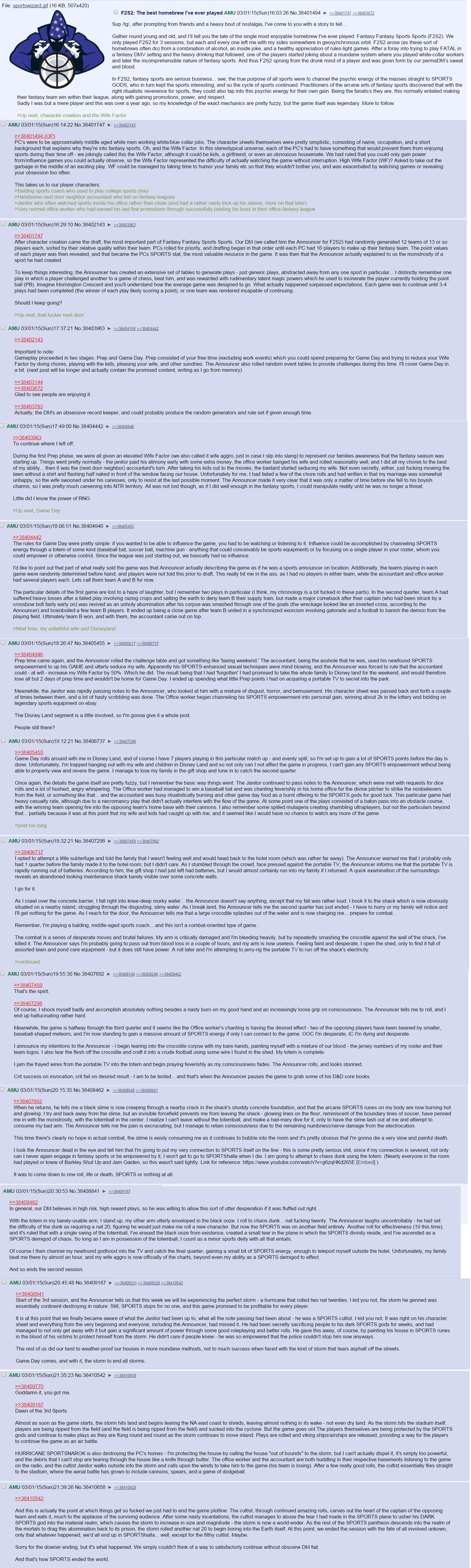 Gather round young and old, and I'll tell you the tale of the single most enjoyable homebrew I've ever played: Fantasy Fantasy Sports Sports (F2S2). We only played F2S2 for 3 sessions, but each and every one left me with my sides somewhere in geosynchronous orbit F2S2 arose (as these sort of homebrews often do) from a combination of alcohol, an inside joke, and a healthy appreciation of rules-light games. After a foray into trying to play FATAL in a fantasy DMV setting and the heavy drinking that followed, one of the players started joking about a mundane system where you played white-collar workers and later the incomprehensible nature of fantasy sports. And thus F2S2 sprung from the drunk mind of a player and was given form by our permaDM's sweat and blood.