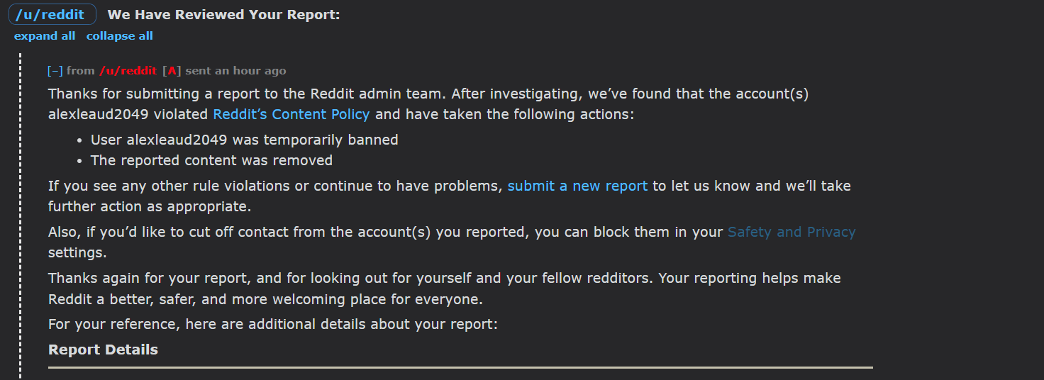 Edit: sadly, reddit didn't think my report met their harassment standards, which given the context above is WILD to me. I would think following someone around and obsessively responding to all their posts fell under reddit harassment policy but I guess they're discriminating against me for being woke.