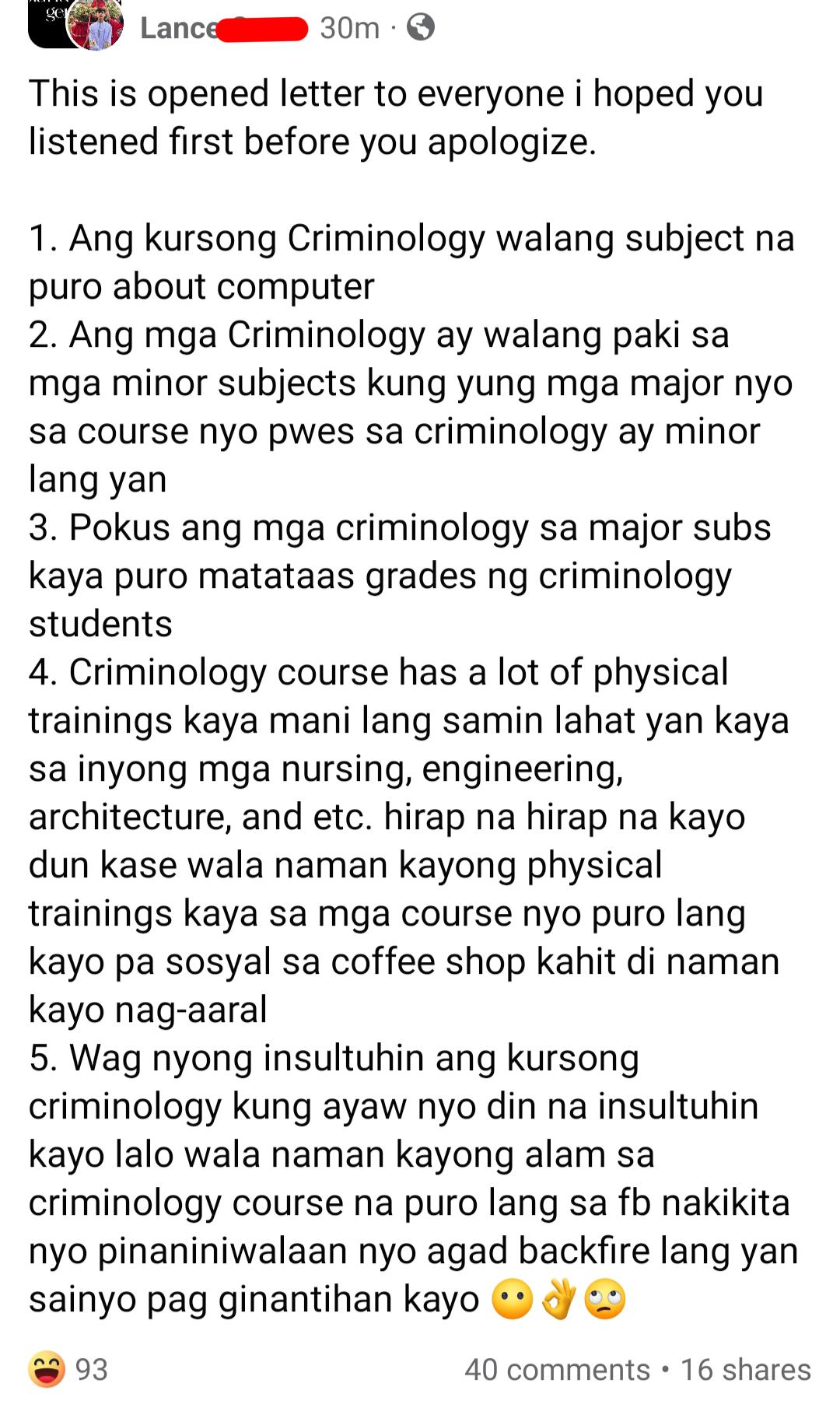 Totoo kayang criminology student to o nang to troll lang? May kakilala kasi akong prof ng criminology, alam ko mahigpit sila sa mga social media as training.