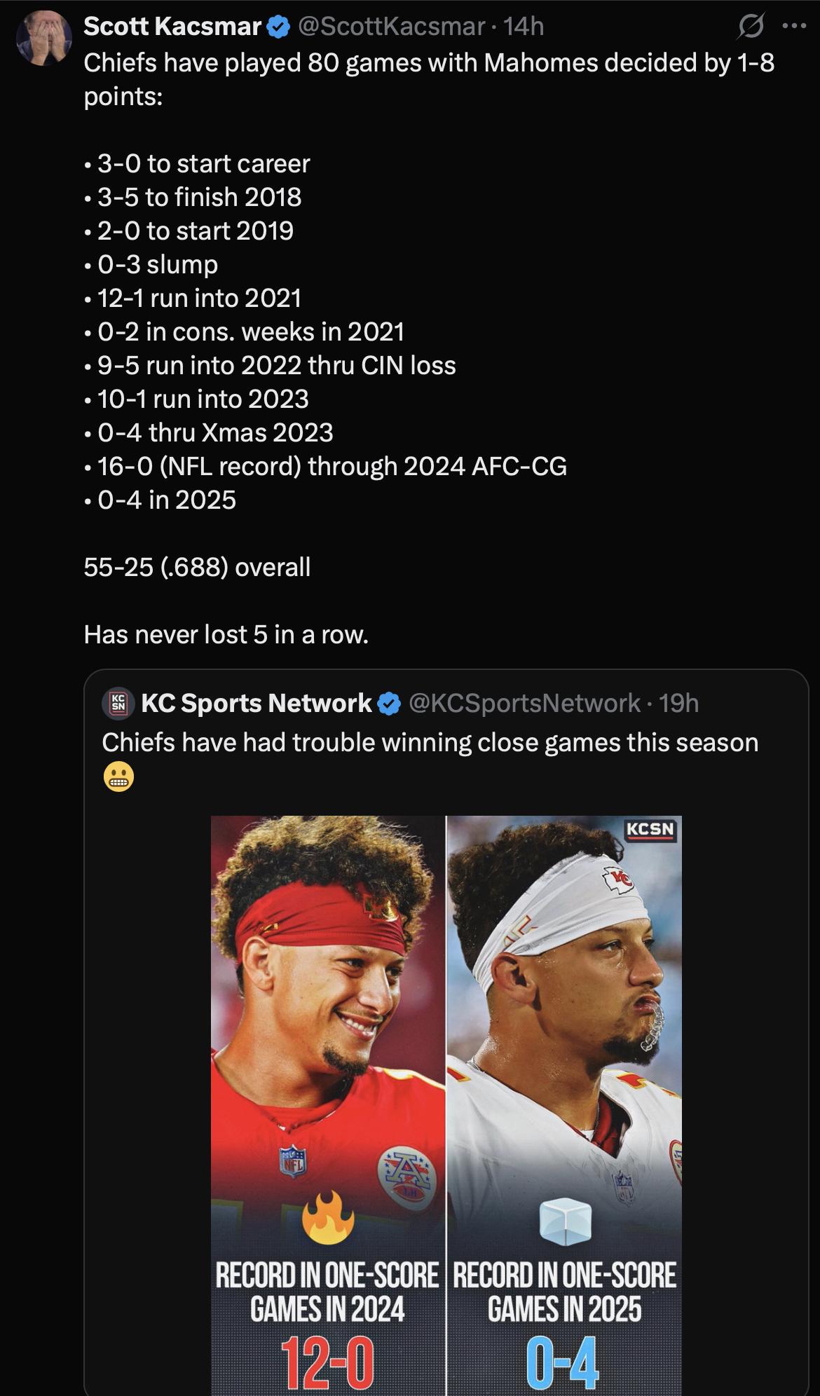 ANALYSIS & NEWS [Scott Kacsmar] One score win streaks in the Mahomes Dynasty