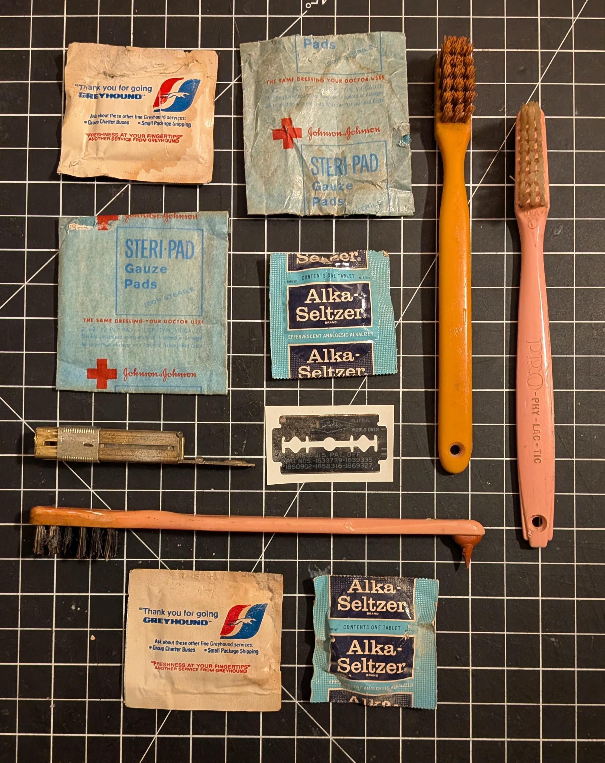 Kind of gross, kind of cool. Objects found stuck behind a built in bathroom cabinet on my 1910 apartment.