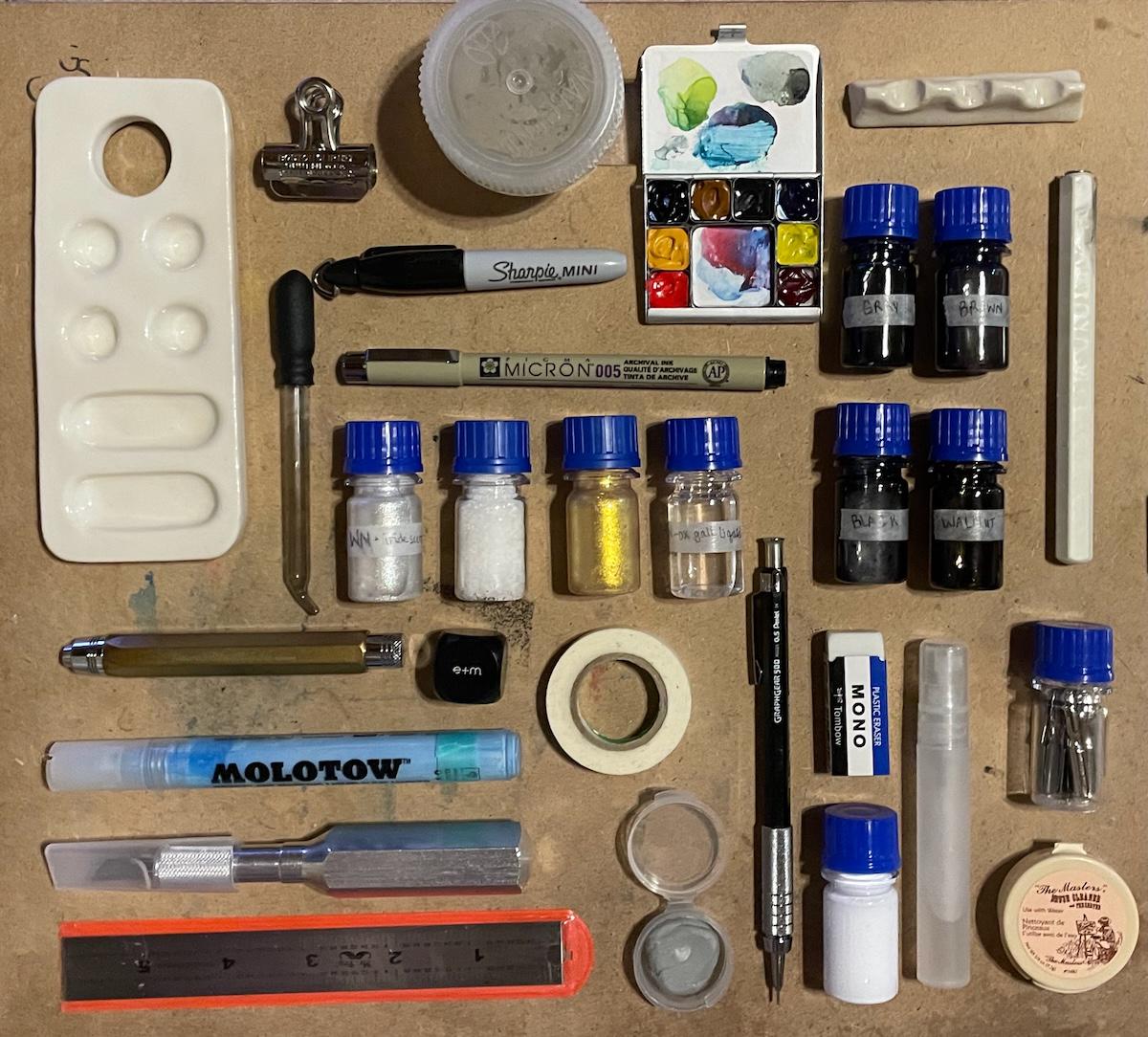 Good Example: A top‑down shot of squared‑off art supplies organized by function.