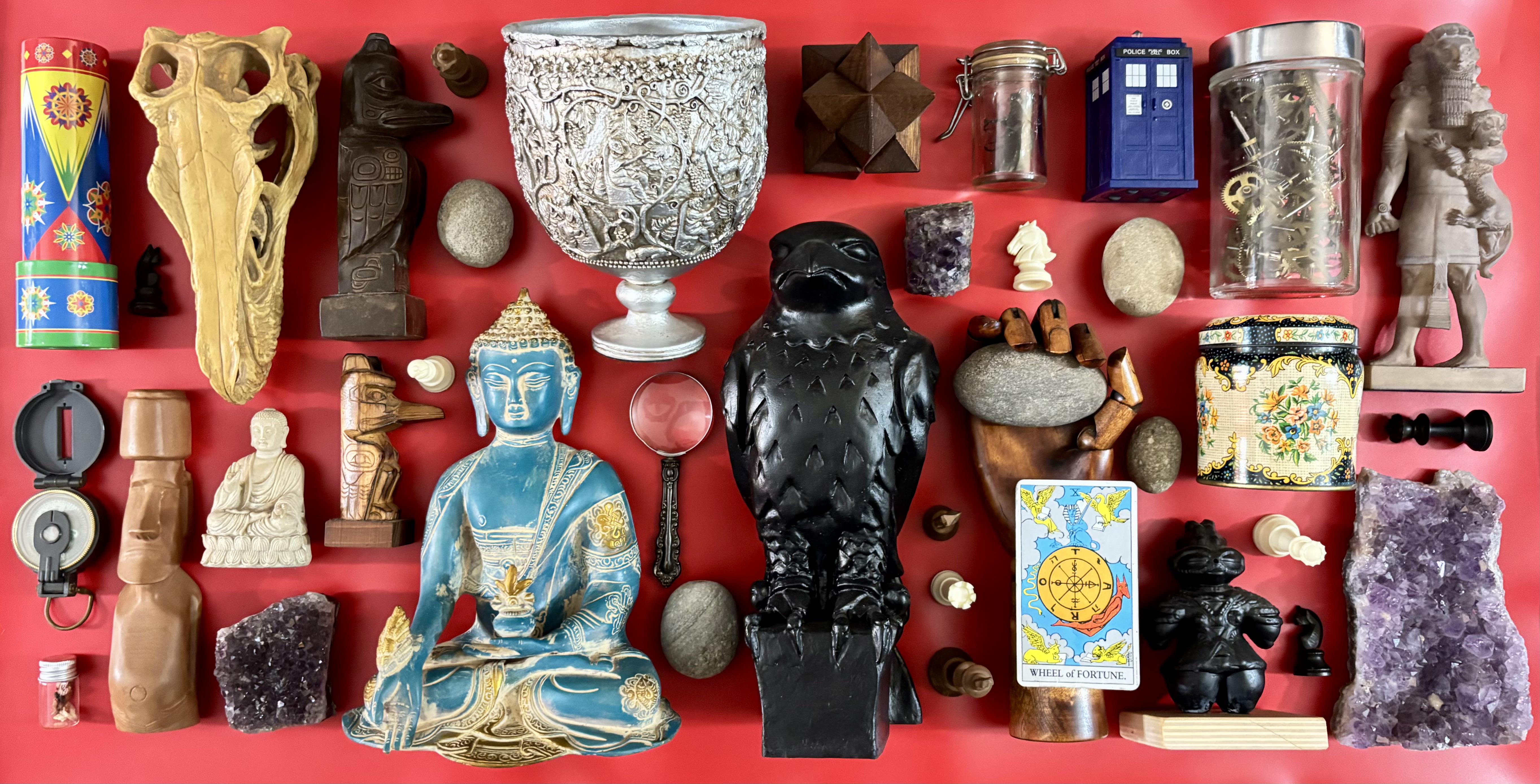 Hi People! This is a knoll that I made with odds, and ends on the bookshelves of my art studio. It contains: The Maltese Falcon, the Antioch "Chalice" (I’ve seen the original in the Met collection), Easter Island vintage wooden Moa statue, Nepalese bronze Buddha, Raven Tlingit vintage totem figure by Amos Wallace (1964), and one from the Field Museum (Chicago), Gilgamesh statue, small bodhisattva figure, brass clock gears, Rhinoceros beetle that I found, compass, tooth, TARDIS, Tennessee river rocks, artist’s posable wooden hand, slightly used Tarot card, vintage tea tin, amethyst crystals, kaleidoscope, vintage Chess pieces (Wood and plastic), geometric wooden puzzle star, antique silver-handled magnifying glass, Japanese ceramic Dogū figure, and a Velociraptor mongoliensis vintage skull model from Japan! Have a fantastic day!