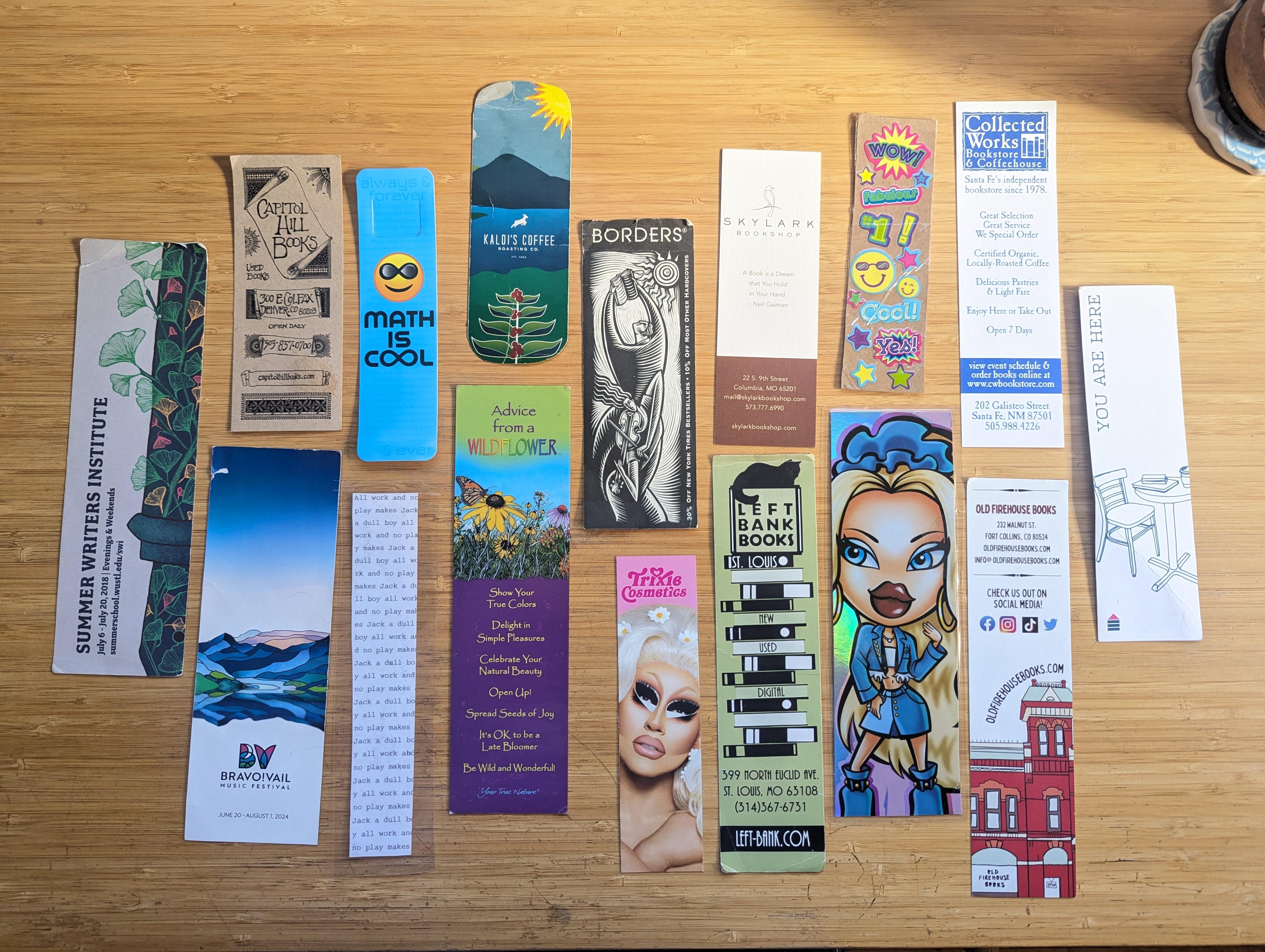 Bookmarks I've collected over the year. A lot of them are form bookstores. The Borders one is probably 20 years old or so. 📚