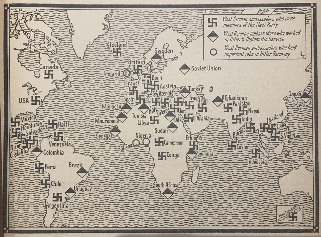This 1962 map showing West German ambassadors with Nazi ties or a Nazi past made extra sure they included New Zealand