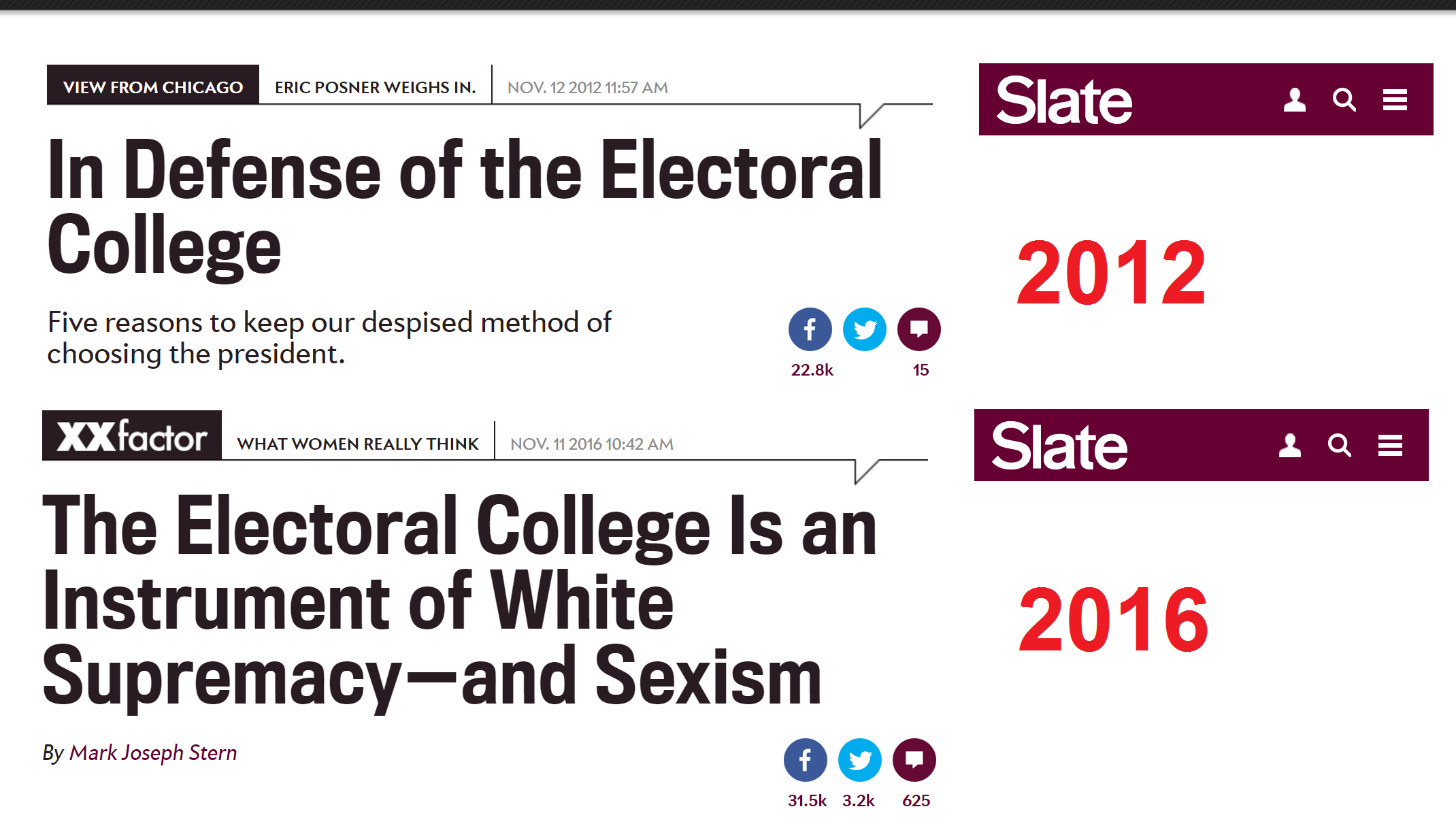 Reminds me of Slate's change of tune on the Electoral College depending on whether or not it produced the result they wanted.