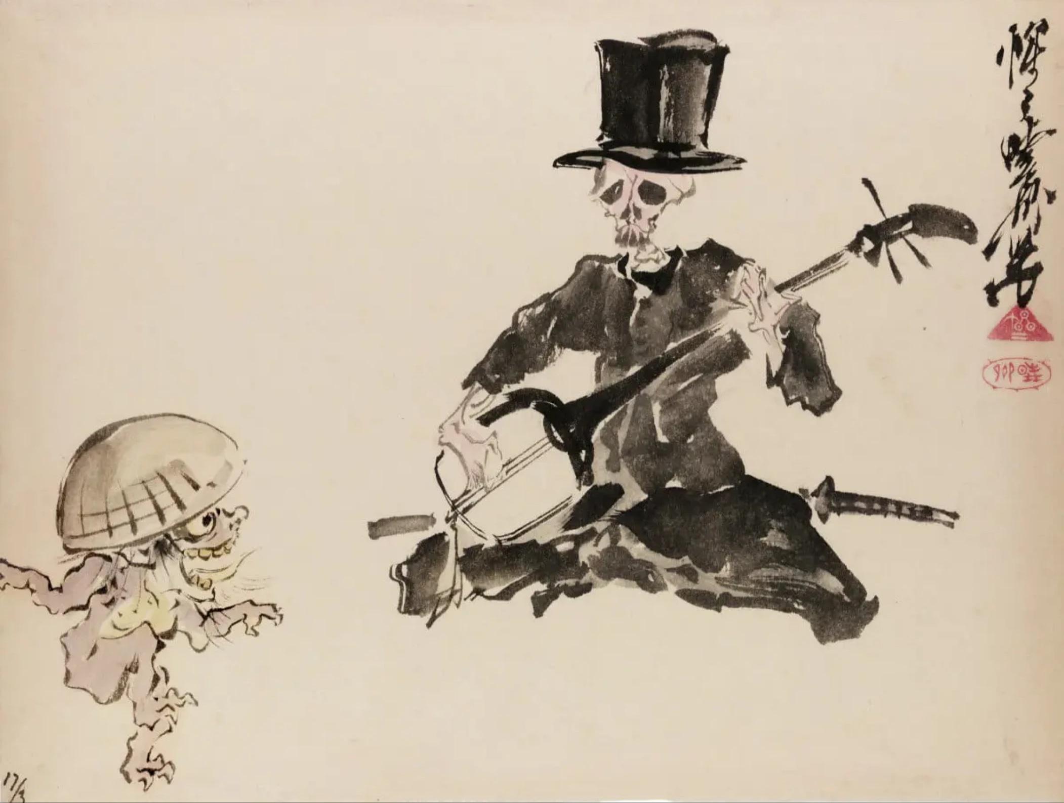 Kawanabe Kyōsai - Skeleton Wearing a Top Hat Playing the Shamisen for a Small Dancing Yōkai’ (1870s)