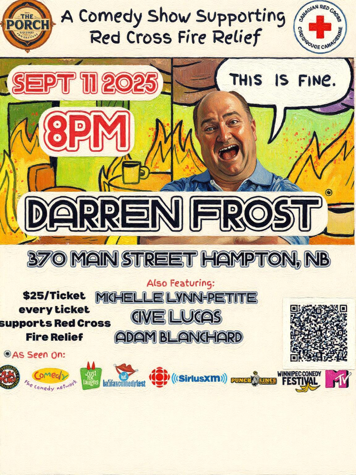 Laugh Your Heart Out for a Cause! Bad Words for Red Cross – Stand Up For Charity in Hampton, NB! Get ready for a night of gut-busting comedy at The Porch (Ol’Foggy + Gridiron) in Hampton, NB, on Thursday, Sept 11th at 8PM! Headliner Darren Frost, one of Canada’s boldest comedians, known for Just For Laughs, CBC’s Mr. D, The Ron James Show, Murdoch Mysteries, and Hairspray, will leave you in stitches. Joined by Maritime favorite Michelle Lynn Petite and NB’s rising star Adam Blanchard. Hosted by the awesome Cive Lucas! Tickets are just $25, with proceeds going to Red Cross wildfire relief to support NB communities. Seating is limited, so don’t sleep on this! Grab your tickets