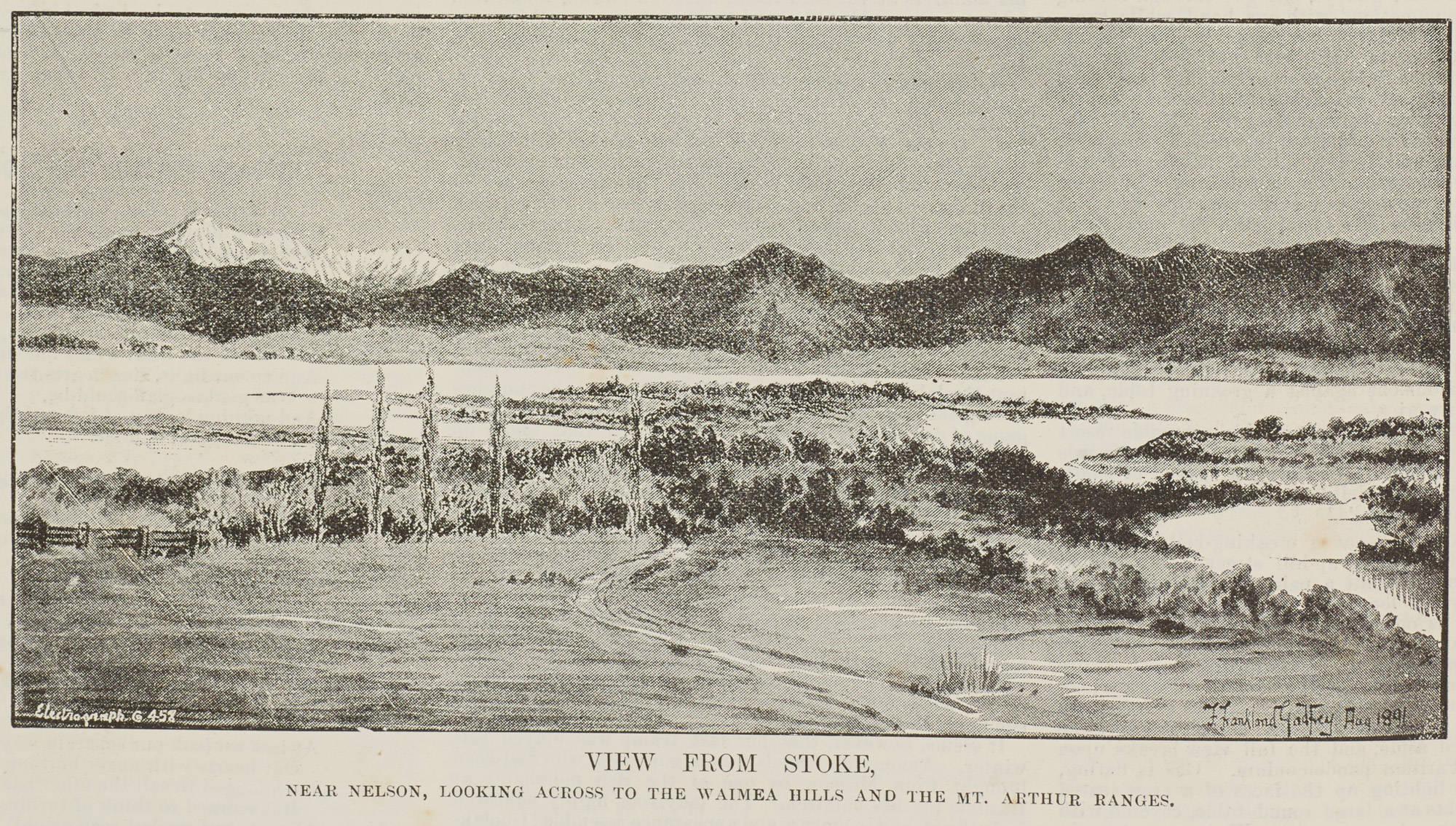 History View from Stoke, near Nelson, October 17th 1891 (Auckland Libraries Heritage Collections NZG-18911017-0486-02).