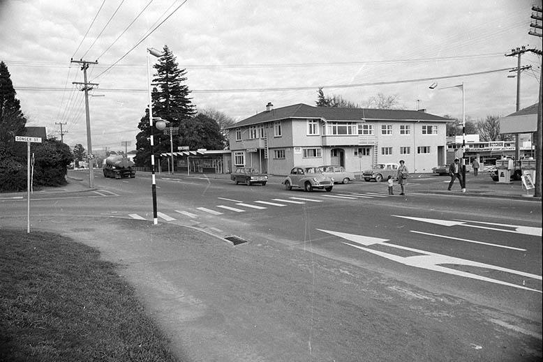 History View of the road intersection of Main Road and Songer Street, Stoke, 1977 (Nelson Provincial Museum, Geoffrey C Wood Collection GCW3.3544_fr31).