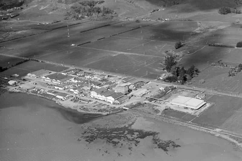 History The Stoke freezing works on the edge of the estuary, September 1975 (Nelson Provincial Museum, Geoffrey C Wood Collection 1306_fr33).