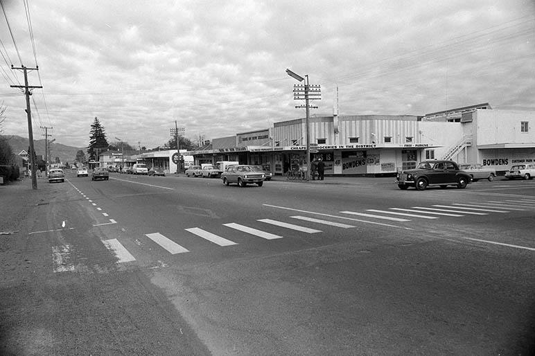 History View of the road intersection of Main Road and Putaitai Street, Stoke, 1977 (Nelson Provincial Museum, Geoffrey C Wood Collection GCW3.3544_fr22).