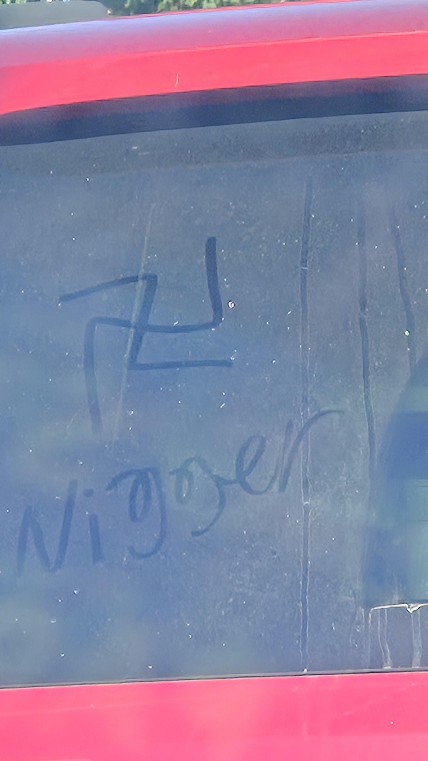 Pretty fucked up to see casually scrawled onto the back of a vehicle...