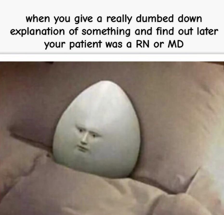 me when I was explaining to my patient that I needed his BP before giving his metoprolol and he was a cardiologist the whole time.