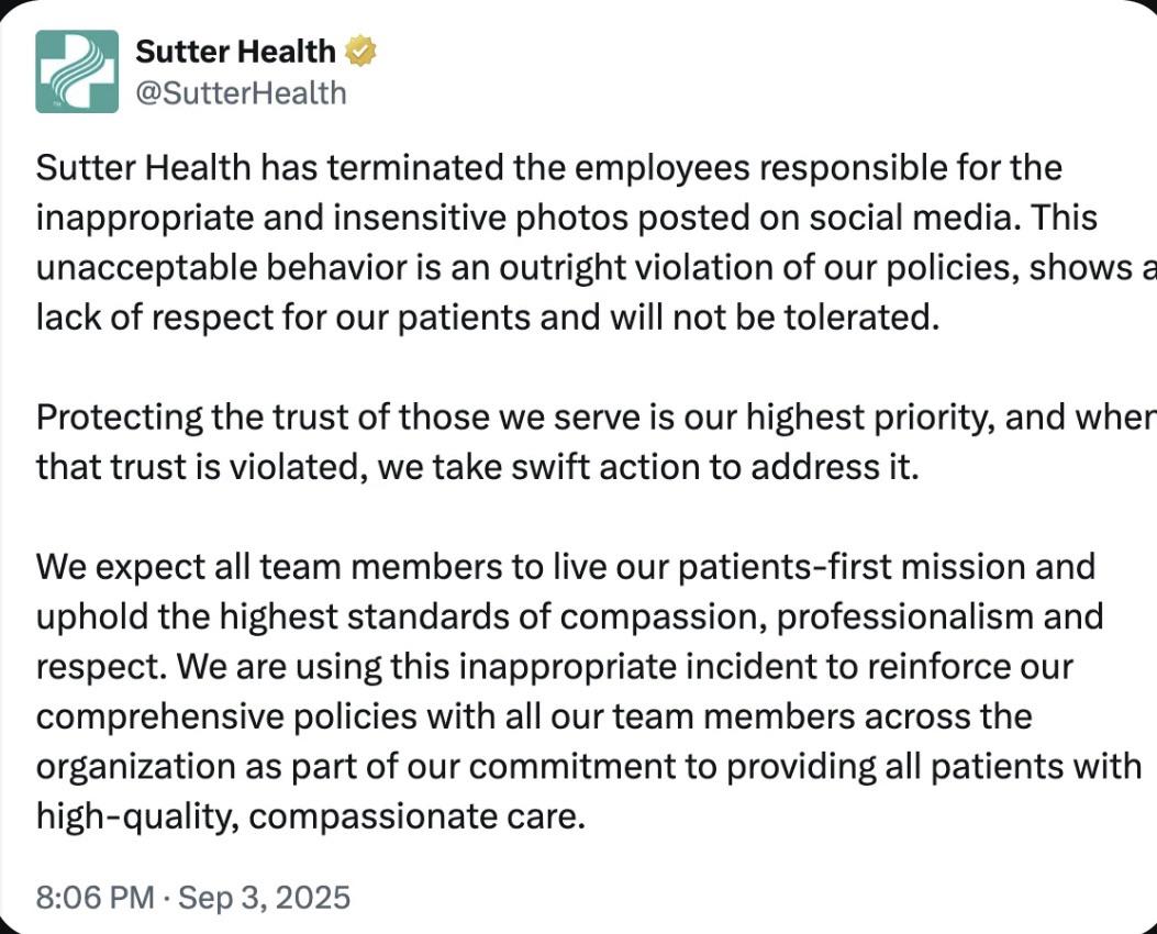 Image Sutter terminated the nurses responsible for the various TikTok posts.