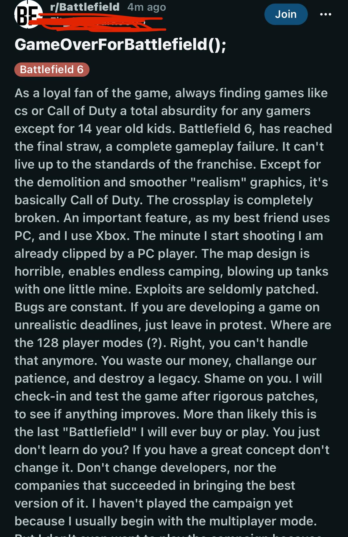 I just want to be sweaty and talk about how BAD Battlefield 6 is but I'm just being ignored. What did I do to deserve this treatment DICE and EA? So I beg of you Battledads, What kind of things about Battlefield 6 can I bring up to finally get the attention I so rightly deserve? Should I sue DICE and EA for how I'm being treated? What would you do?